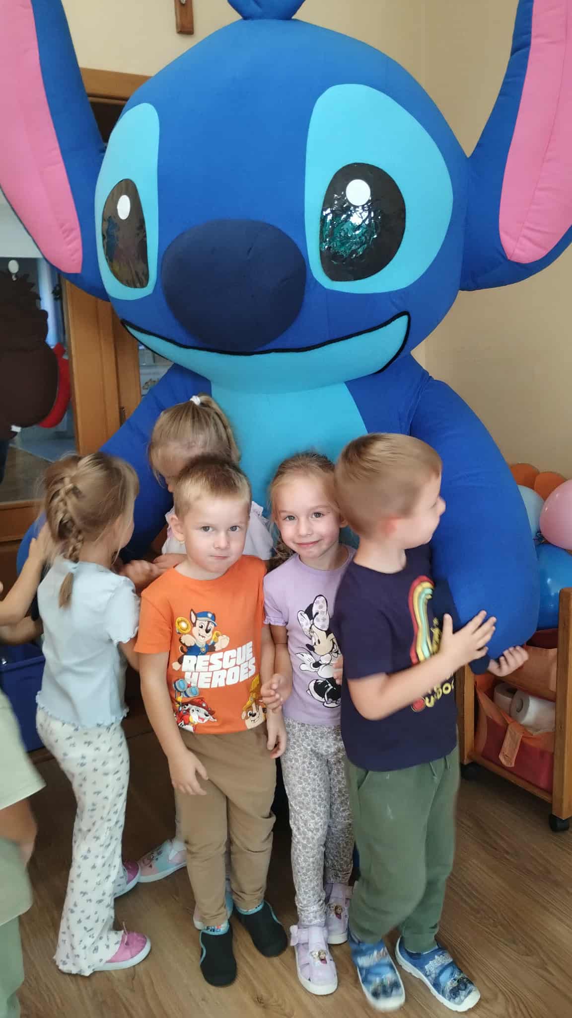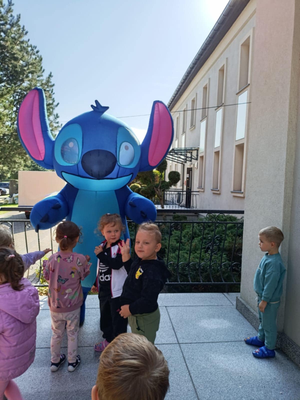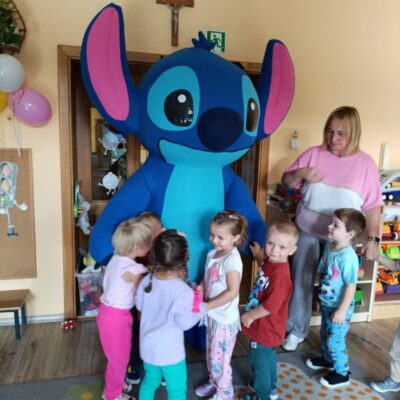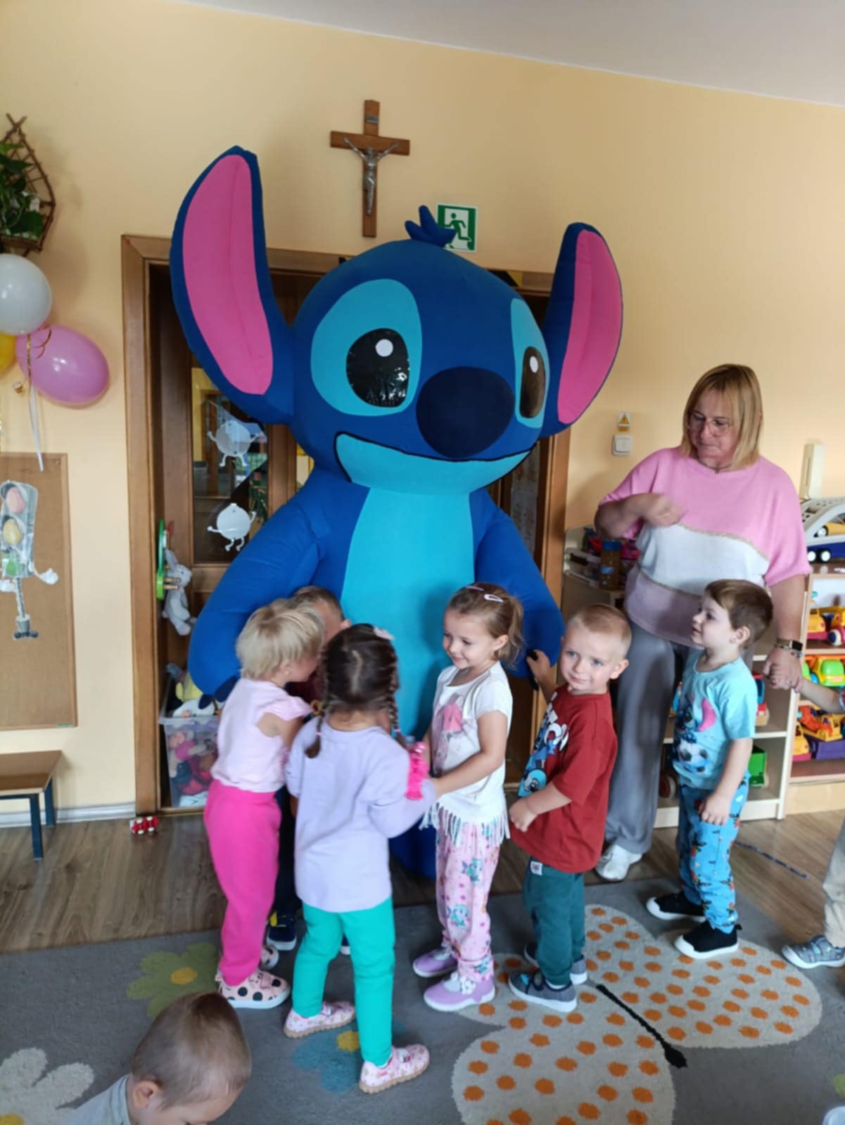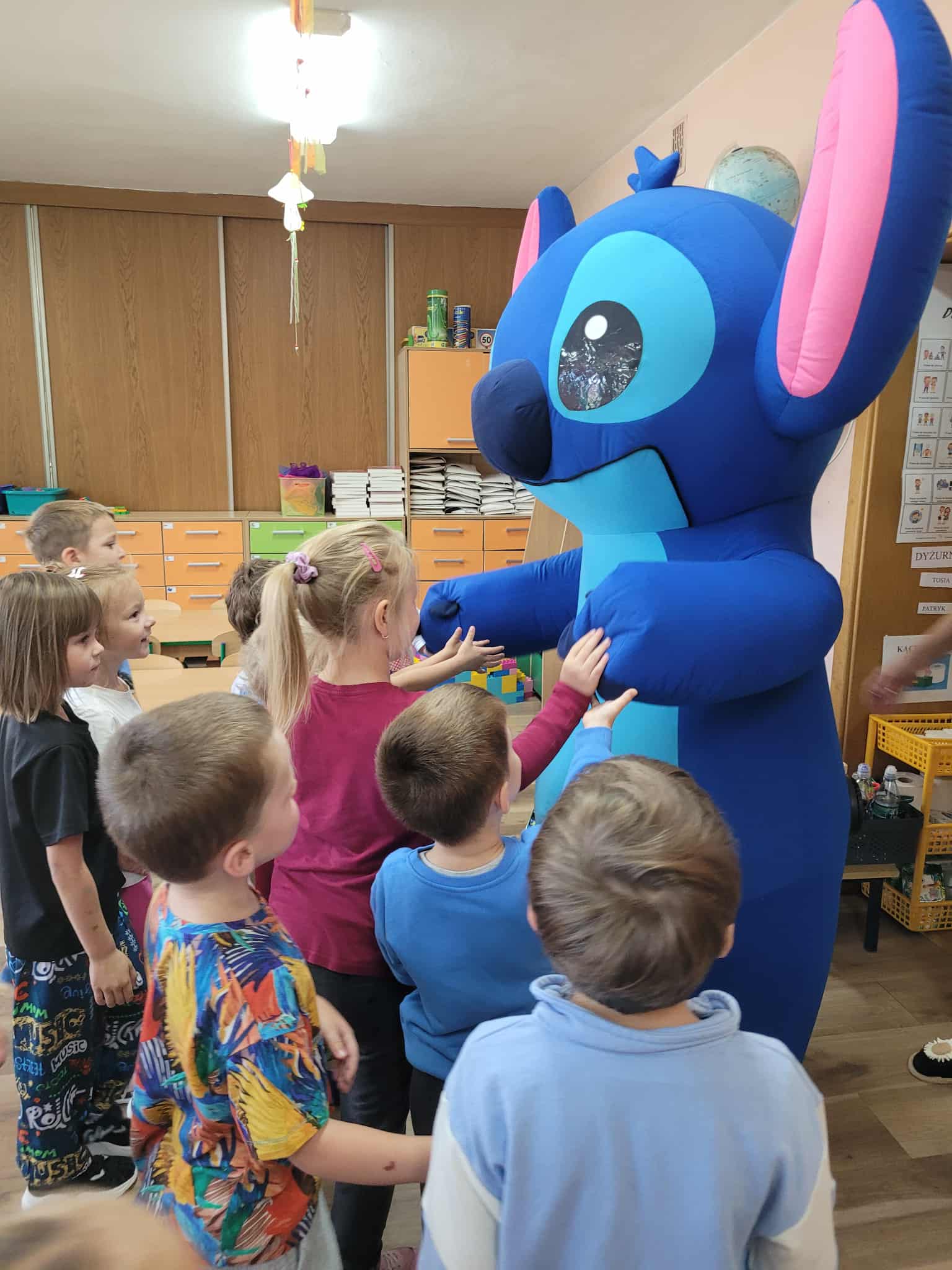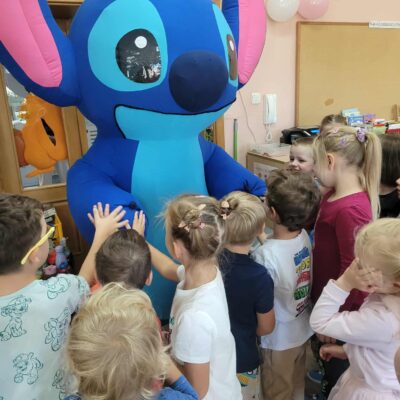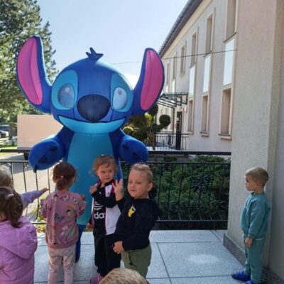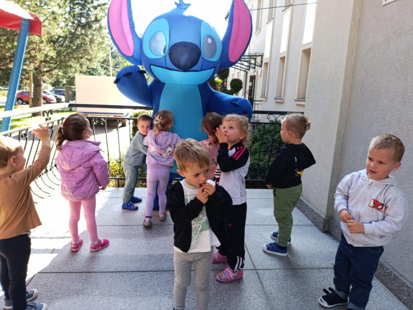 Dziś obchodziliśmy wyjątkowe święto – Dzień Przedszkolaka. Od samego rana w przedszkolu panowała radosna atmosfera, a na dzieci czekało mnóstwo atrakcji. Najpierw odwiedziła nas ogromna, uśmiechnięta maskotka Stich, która witała dzieci, robiła z nimi zdjęcia i zapraszała do wspólnej zabawy. Radości i śmiechu było co niemiara! Kolejną atrakcją był mobilny figloraj – kolorowe zjeżdżalnie, tunele i miękkie elementy do skakania i wspinania się. Dzieci mogły do woli korzystać z przygotowanych niespodzianek, rozwijając sprawność ruchową i integrując się z rówieśnikami. Nie zabrakło także zabaw tanecznych i ruchowych. Wspólnie tańczyliśmy przy wesołej muzyce, a dzieci chętnie uczestniczyły w grach, konkursach i pląsach, które dodawały energii i uśmiechu każdemu uczestnikowi. Dużym hitem były również  bańki mydlane – dzieci z zachwytem łapały migoczące bańki.  To był dzień pełen uśmiechu, dobrej zabawy i wspólnych przeżyć, który na długo zostanie w naszej pamięci.