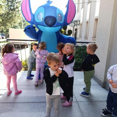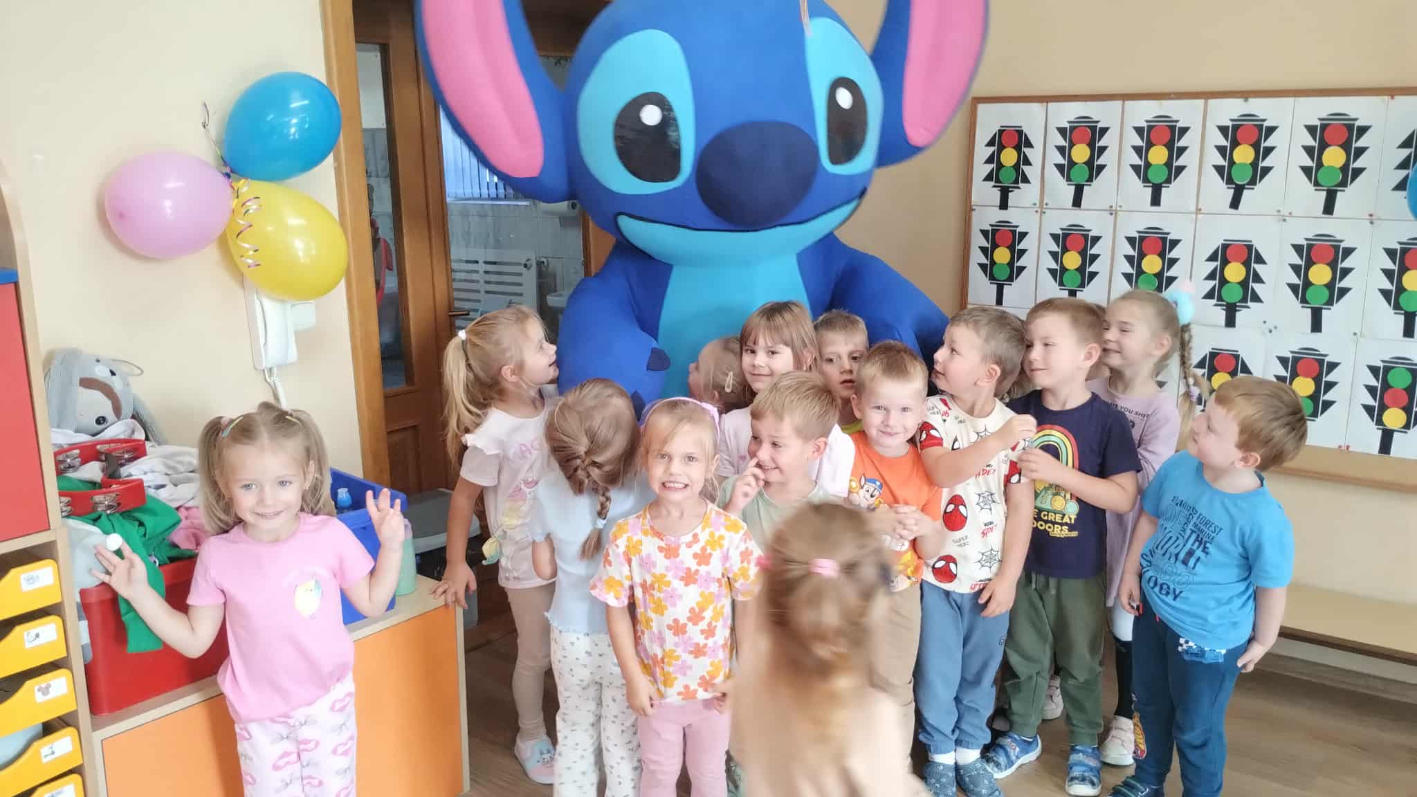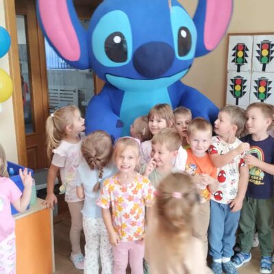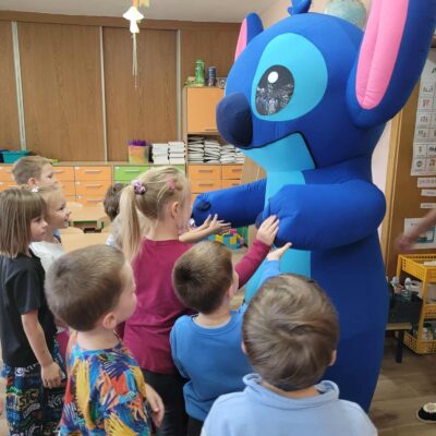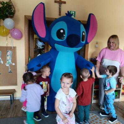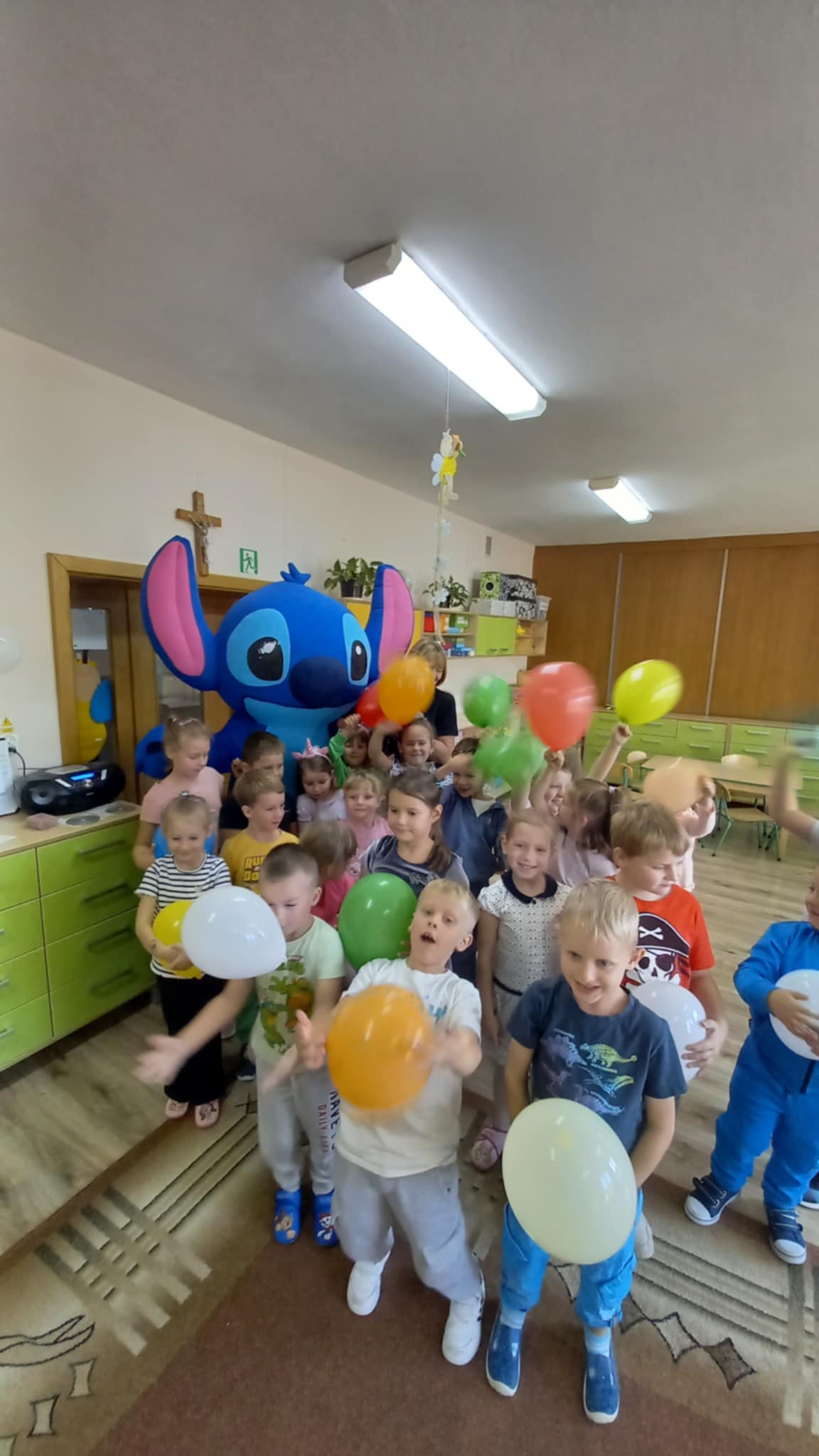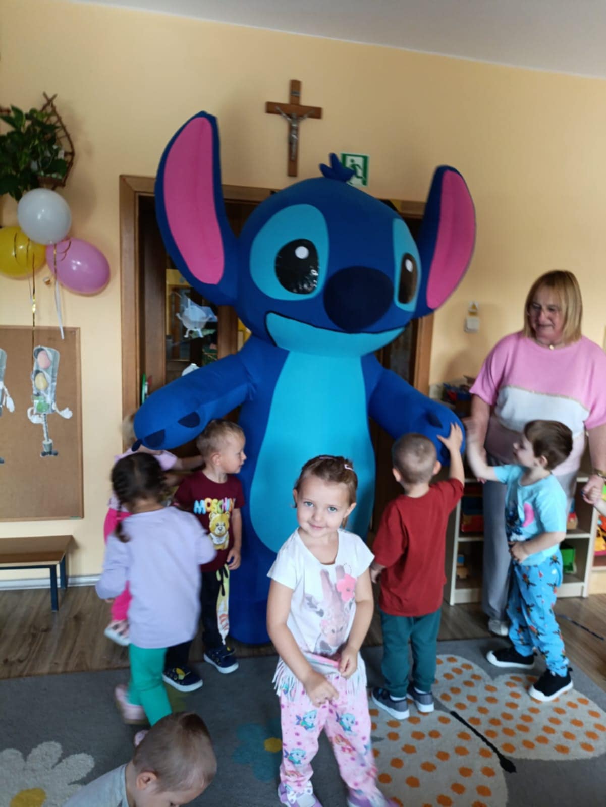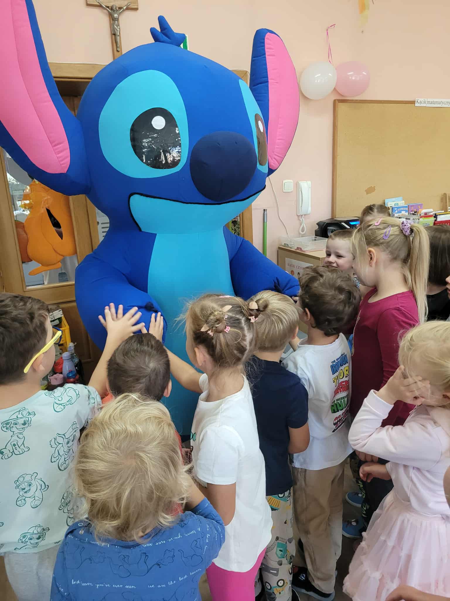 Dziś obchodziliśmy wyjątkowe święto – Dzień Przedszkolaka. Od samego rana w przedszkolu panowała radosna atmosfera, a na dzieci czekało mnóstwo atrakcji. Najpierw odwiedziła nas ogromna, uśmiechnięta maskotka Stich, która witała dzieci, robiła z nimi zdjęcia i zapraszała do wspólnej zabawy. Radości i śmiechu było co niemiara! Kolejną atrakcją był mobilny figloraj – kolorowe zjeżdżalnie, tunele i miękkie elementy do skakania i wspinania się. Dzieci mogły do woli korzystać z przygotowanych niespodzianek, rozwijając sprawność ruchową i integrując się z rówieśnikami. Nie zabrakło także zabaw tanecznych i ruchowych. Wspólnie tańczyliśmy przy wesołej muzyce, a dzieci chętnie uczestniczyły w grach, konkursach i pląsach, które dodawały energii i uśmiechu każdemu uczestnikowi. Dużym hitem były również  bańki mydlane – dzieci z zachwytem łapały migoczące bańki.  To był dzień pełen uśmiechu, dobrej zabawy i wspólnych przeżyć, który na długo zostanie w naszej pamięci.