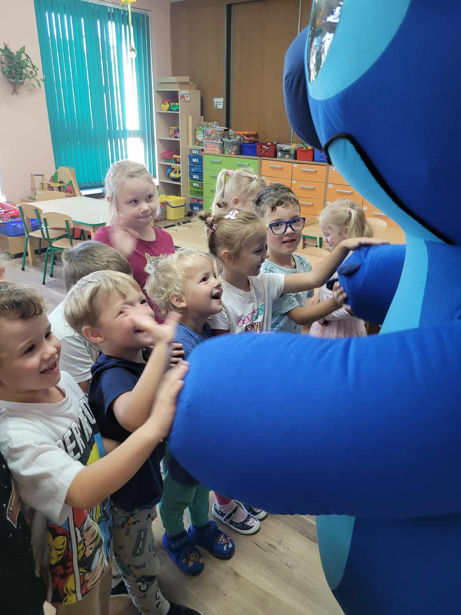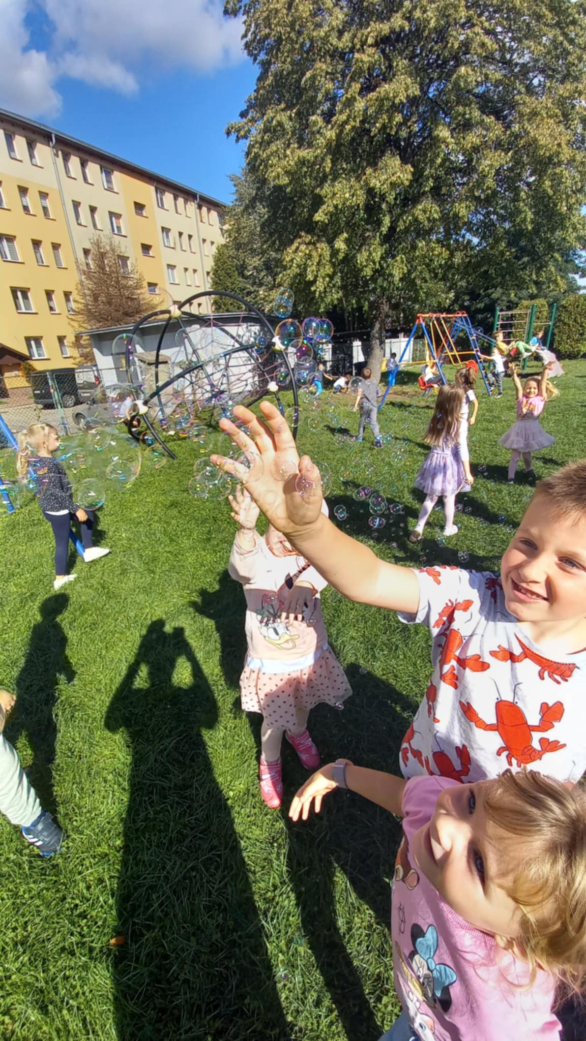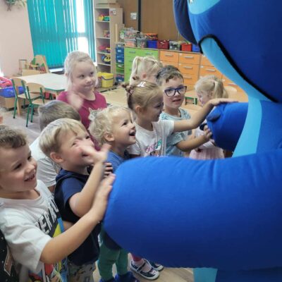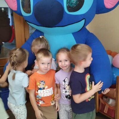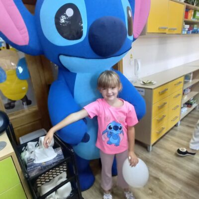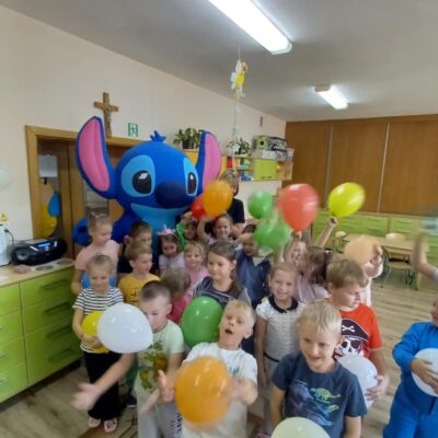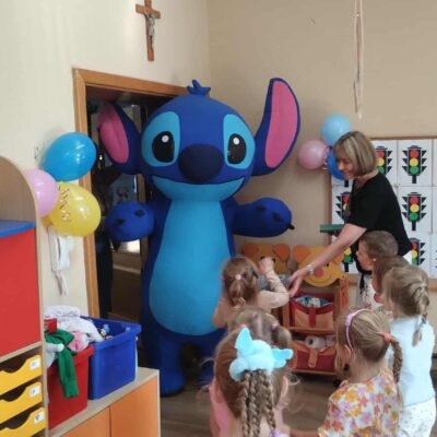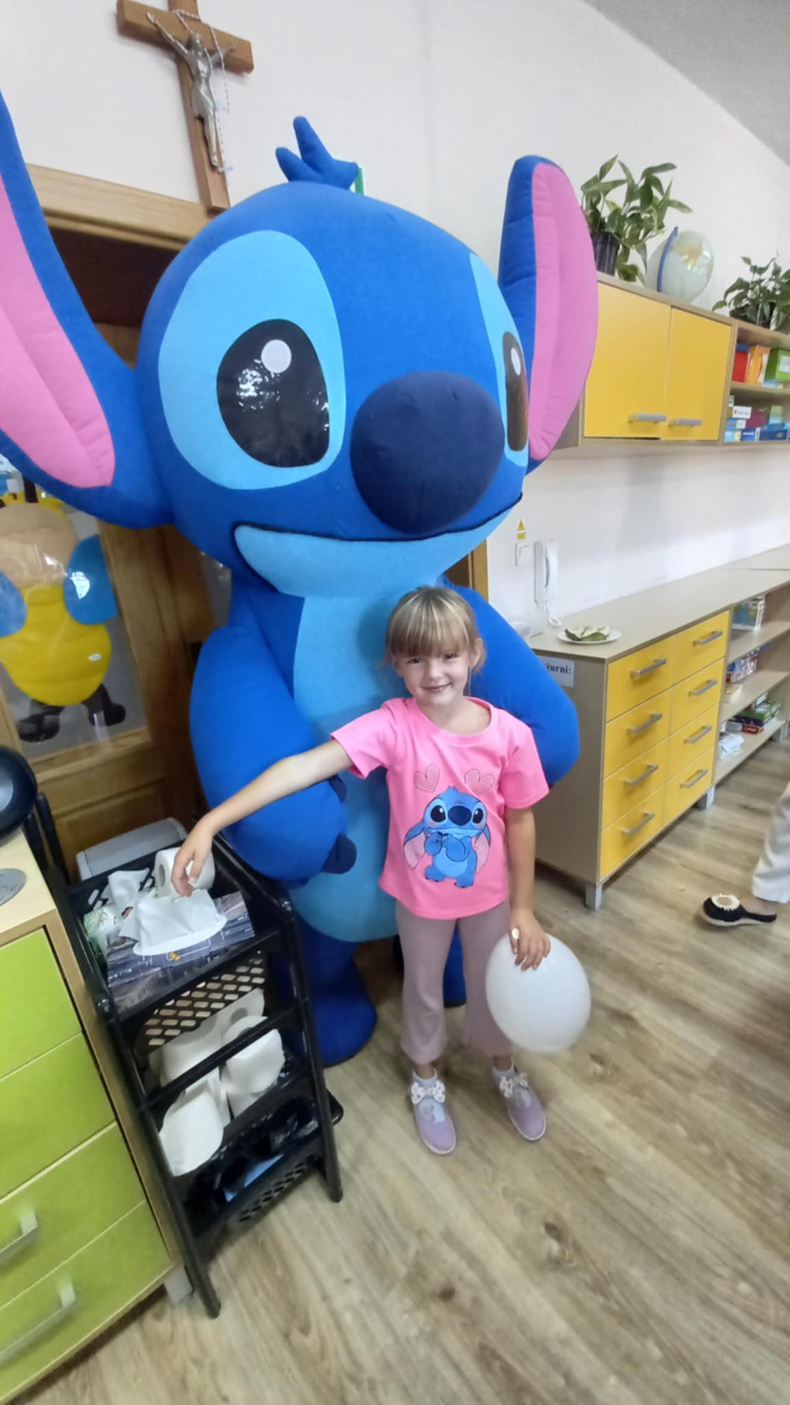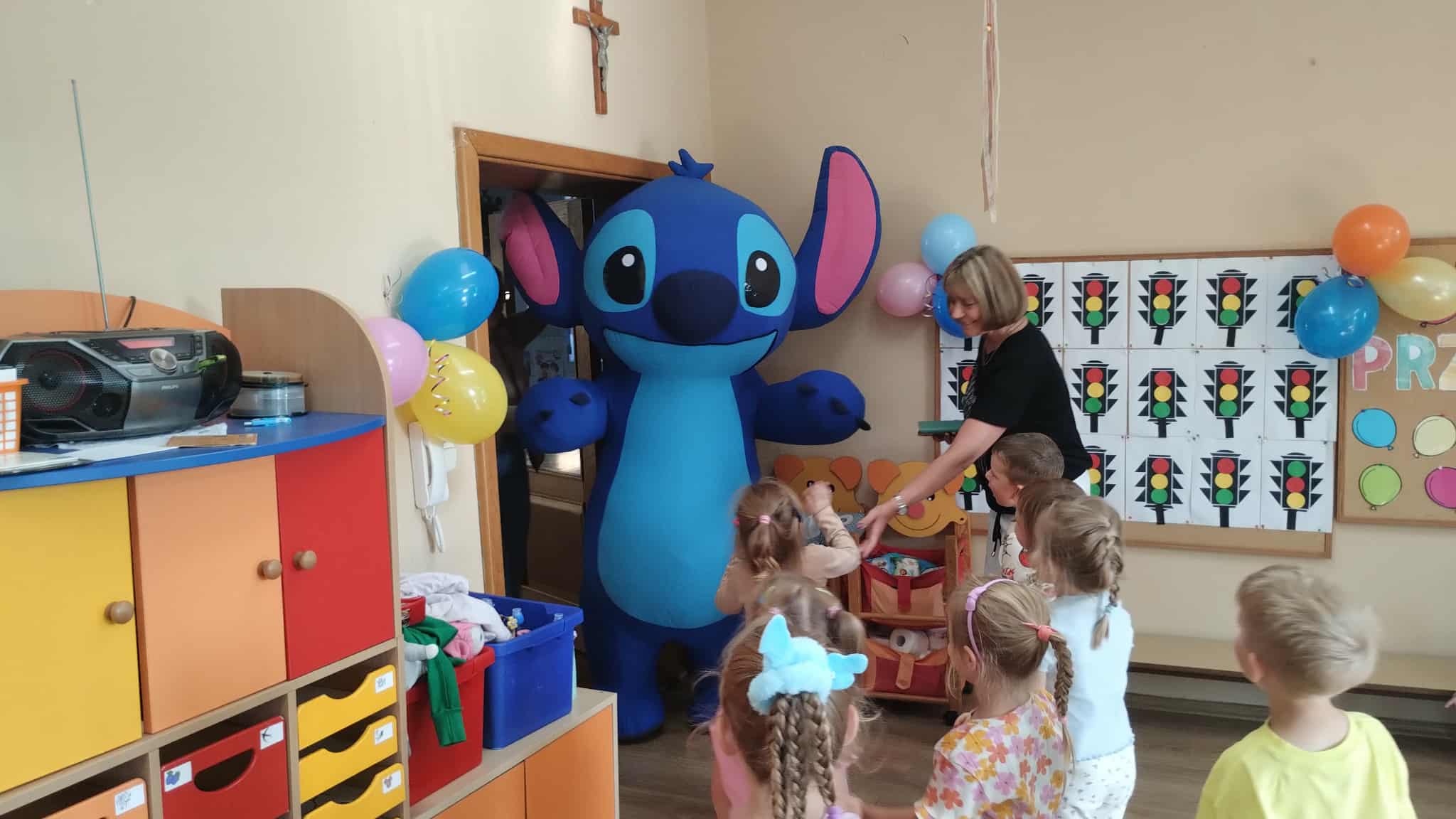Dziś obchodziliśmy wyjątkowe święto – Dzień Przedszkolaka. Od samego rana w przedszkolu panowała radosna atmosfera, a na dzieci czekało mnóstwo atrakcji. Najpierw odwiedziła nas ogromna, uśmiechnięta maskotka Stich, która witała dzieci, robiła z nimi zdjęcia i zapraszała do wspólnej zabawy. Radości i śmiechu było co niemiara! Kolejną atrakcją był mobilny figloraj – kolorowe zjeżdżalnie, tunele i miękkie elementy do skakania i wspinania się. Dzieci mogły do woli korzystać z przygotowanych niespodzianek, rozwijając sprawność ruchową i integrując się z rówieśnikami. Nie zabrakło także zabaw tanecznych i ruchowych. Wspólnie tańczyliśmy przy wesołej muzyce, a dzieci chętnie uczestniczyły w grach, konkursach i pląsach, które dodawały energii i uśmiechu każdemu uczestnikowi. Dużym hitem były również  bańki mydlane – dzieci z zachwytem łapały migoczące bańki.  To był dzień pełen uśmiechu, dobrej zabawy i wspólnych przeżyć, który na długo zostanie w naszej pamięci.