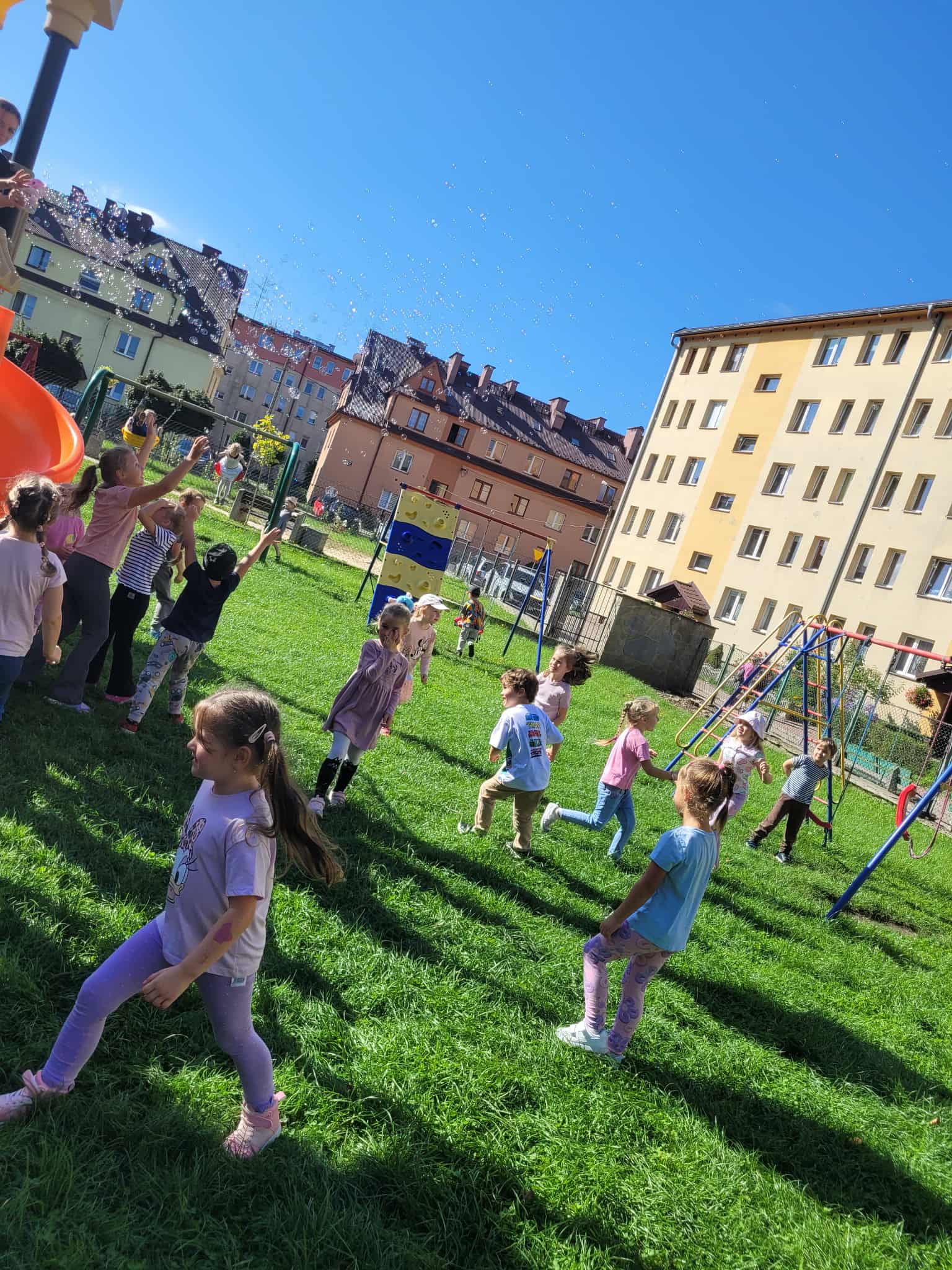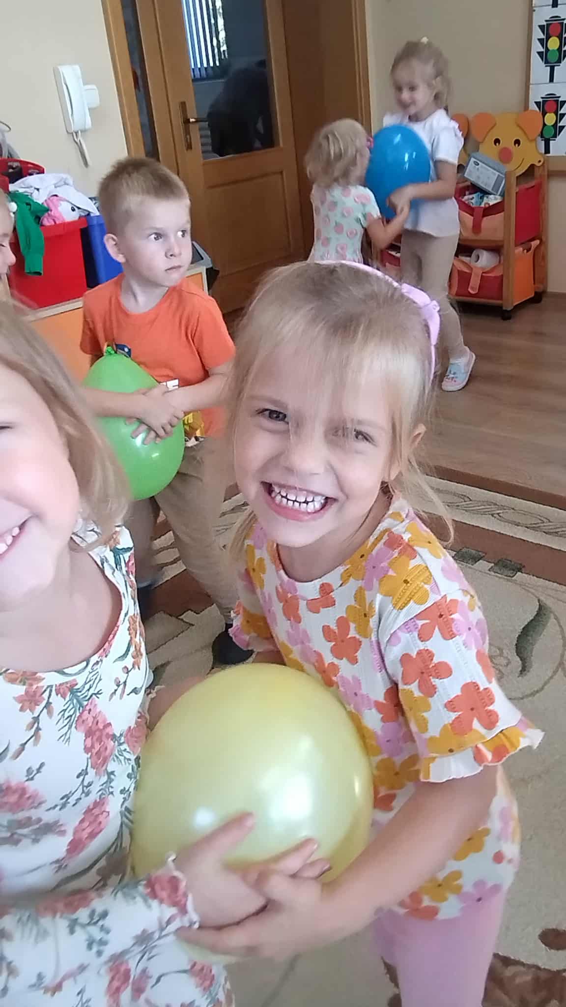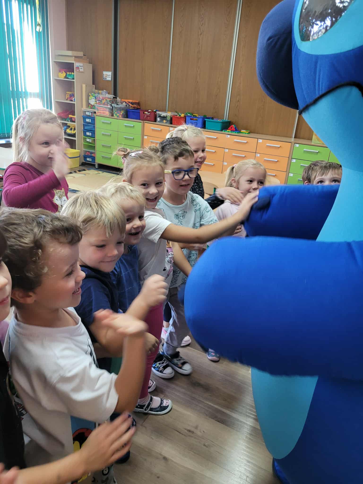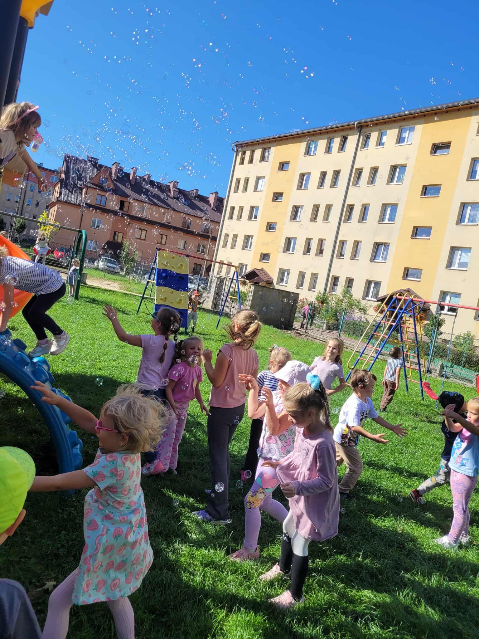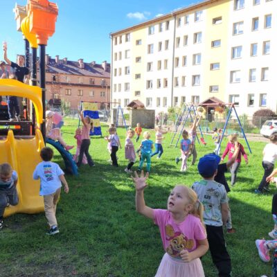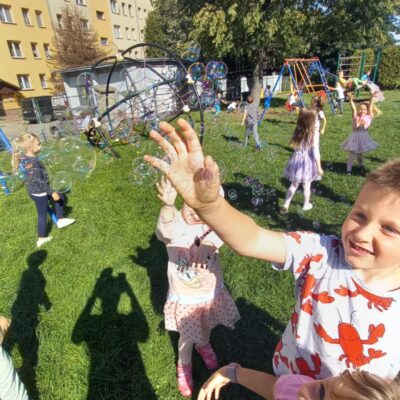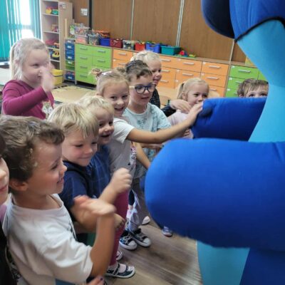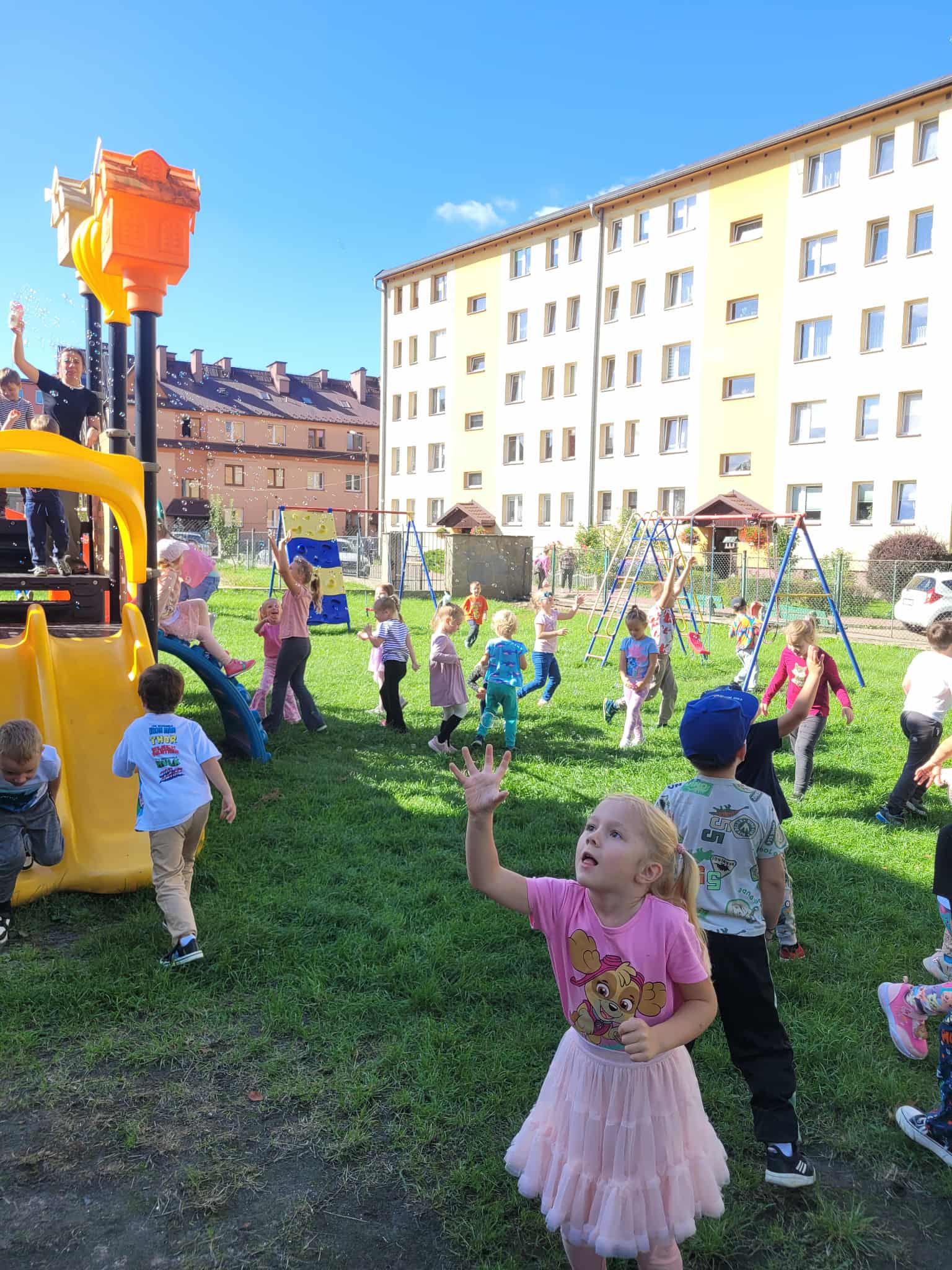 Dziś obchodziliśmy wyjątkowe święto – Dzień Przedszkolaka. Od samego rana w przedszkolu panowała radosna atmosfera, a na dzieci czekało mnóstwo atrakcji. Najpierw odwiedziła nas ogromna, uśmiechnięta maskotka Stich, która witała dzieci, robiła z nimi zdjęcia i zapraszała do wspólnej zabawy. Radości i śmiechu było co niemiara! Kolejną atrakcją był mobilny figloraj – kolorowe zjeżdżalnie, tunele i miękkie elementy do skakania i wspinania się. Dzieci mogły do woli korzystać z przygotowanych niespodzianek, rozwijając sprawność ruchową i integrując się z rówieśnikami. Nie zabrakło także zabaw tanecznych i ruchowych. Wspólnie tańczyliśmy przy wesołej muzyce, a dzieci chętnie uczestniczyły w grach, konkursach i pląsach, które dodawały energii i uśmiechu każdemu uczestnikowi. Dużym hitem były również  bańki mydlane – dzieci z zachwytem łapały migoczące bańki.  To był dzień pełen uśmiechu, dobrej zabawy i wspólnych przeżyć, który na długo zostanie w naszej pamięci.