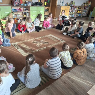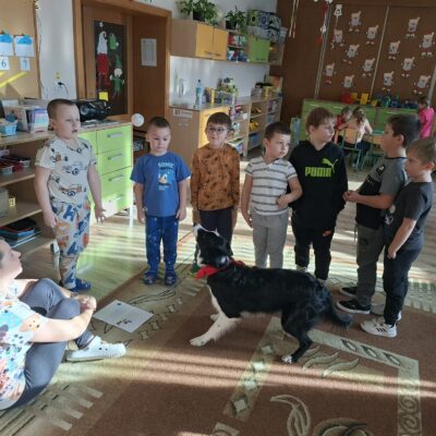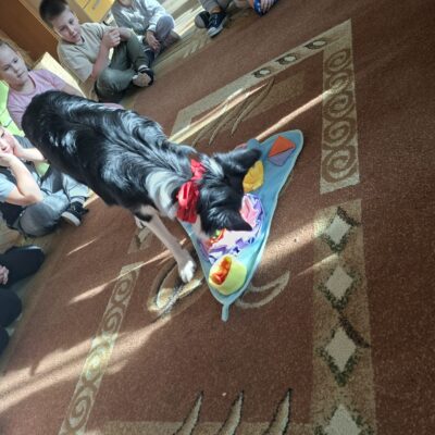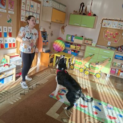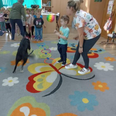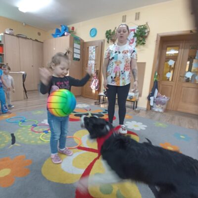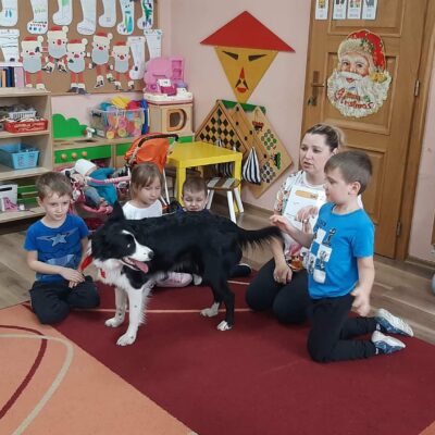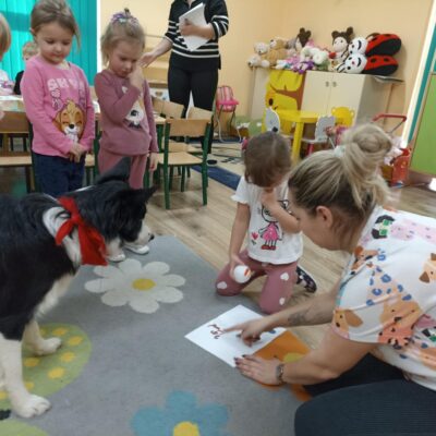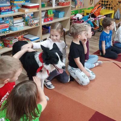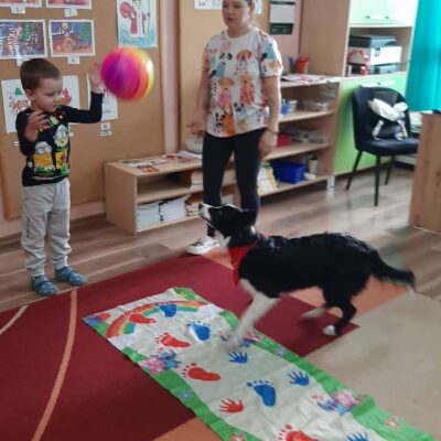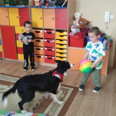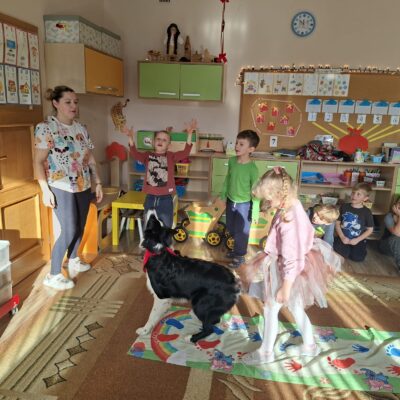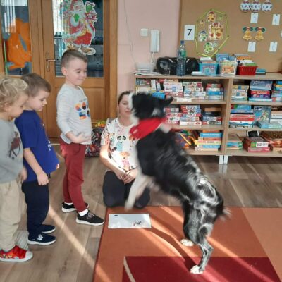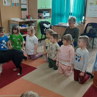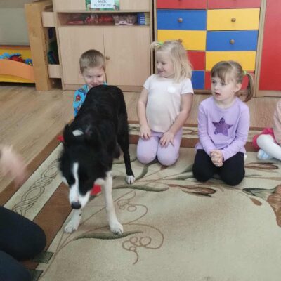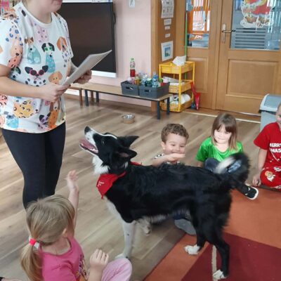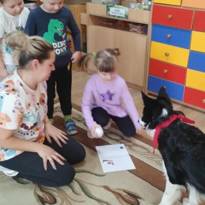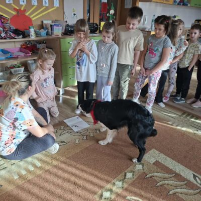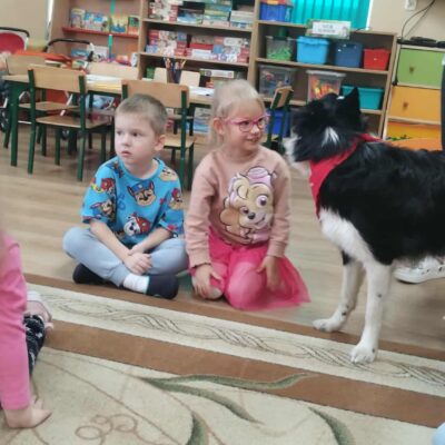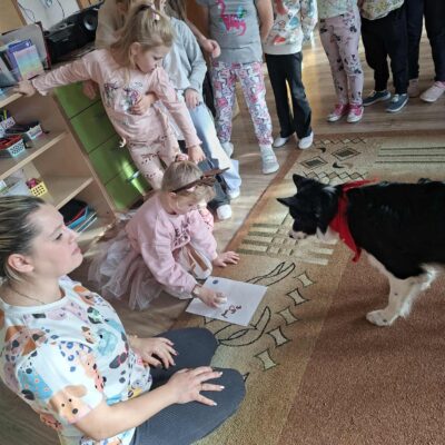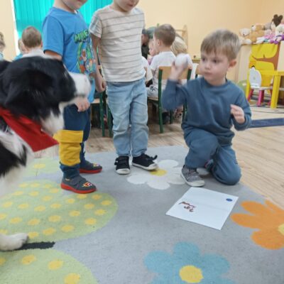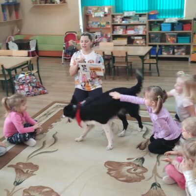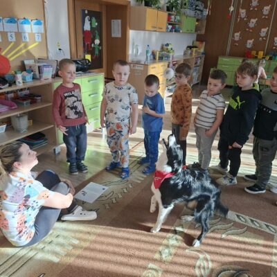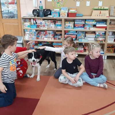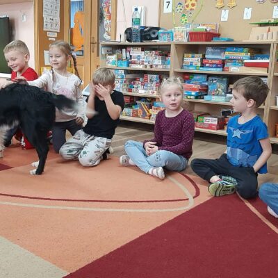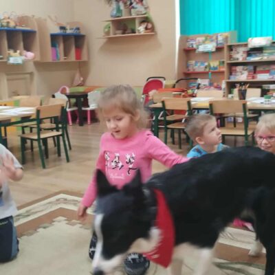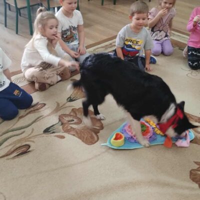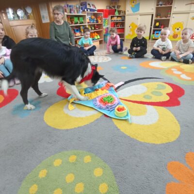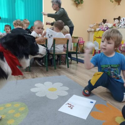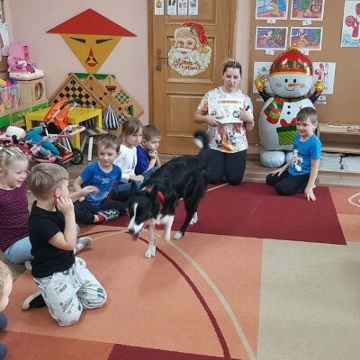 4 grudnia gościliśmy w naszym przedszkolu wyjątkowego gościa. Piesek Kira wraz ze swoją opiekunką odwiedził nasze przedszkolaki. Dzieci zapoznały się z pieskiem oraz dowiedziały, jak należy zachowywać się w obecności psa. Następnie rozpoczęła się wspólna zabawa – maluchy miały za zadanie ukryć dla Kiry smakołyk, a piesek z zaangażowaniem go odszukiwał. Pani opiekunka przeprowadziła również zajęcia edukacyjne z elementami dogoterapii, których celem był wszechstronny rozwój dzieci, dostarczanie pozytywnych bodźców oraz radości z kontaktu z czworonożnym przyjacielem. Dzieci chętnie współpracowały podczas zabaw z pieskiem: wydawały Kirze proste komendy, obserwowały jej reakcje, bawiły się piłką oraz uczestniczyły w ćwiczeniach na specjalnej macie. Podczas praktycznych zajęć przedszkolaki utrwaliły swoją wiedzę dotyczącą właściwego traktowania i opiekowania się zwierzętami. Serdecznie dziękujemy za wizytę i już nie możemy doczekać się następnego spotkania!