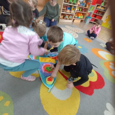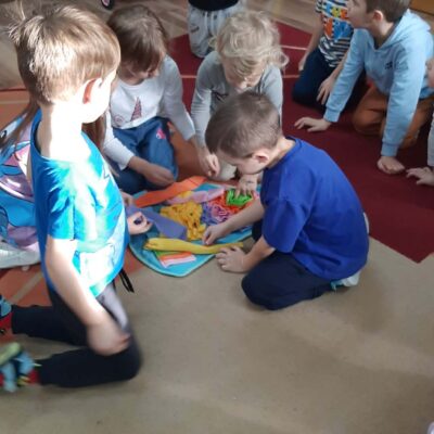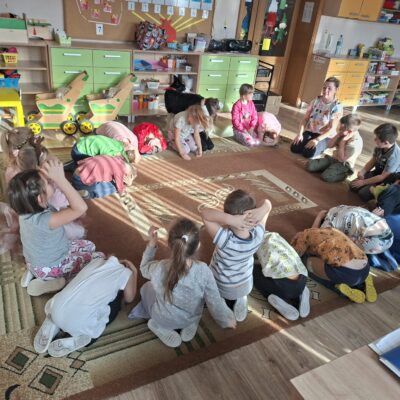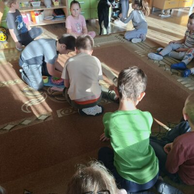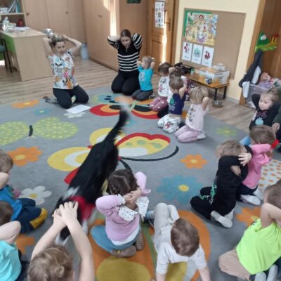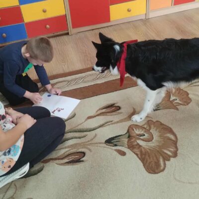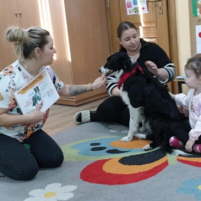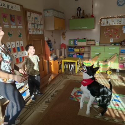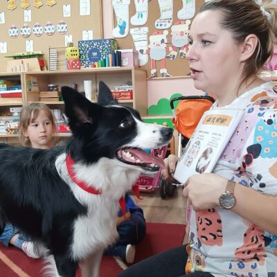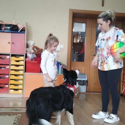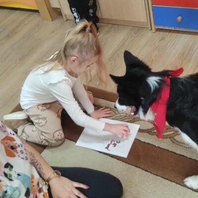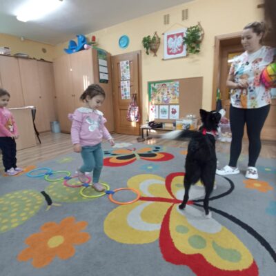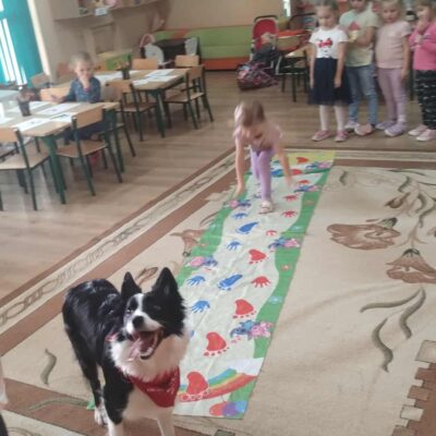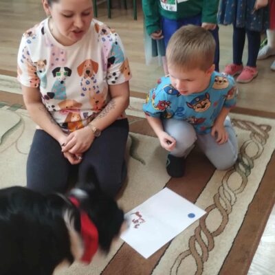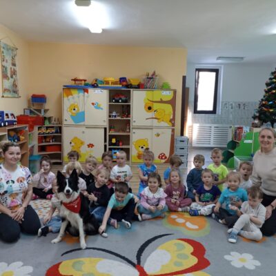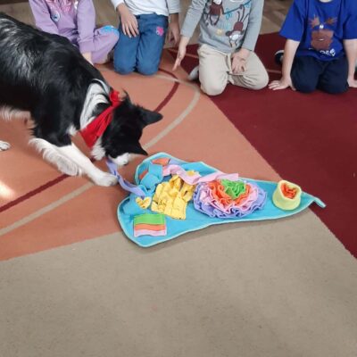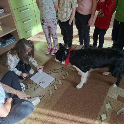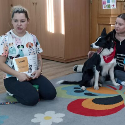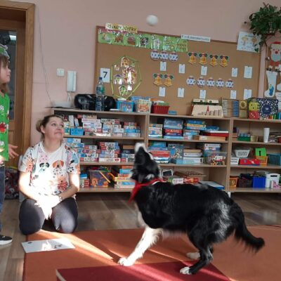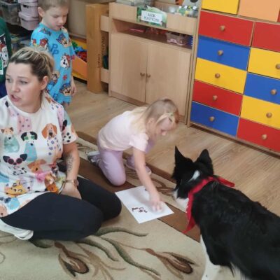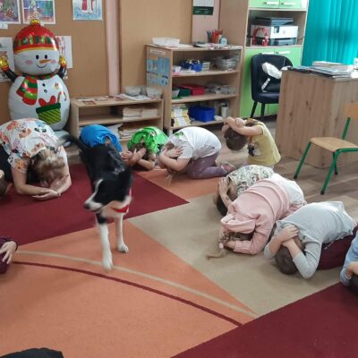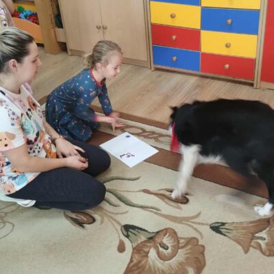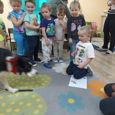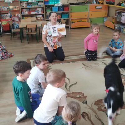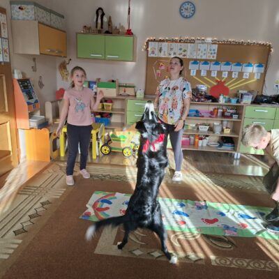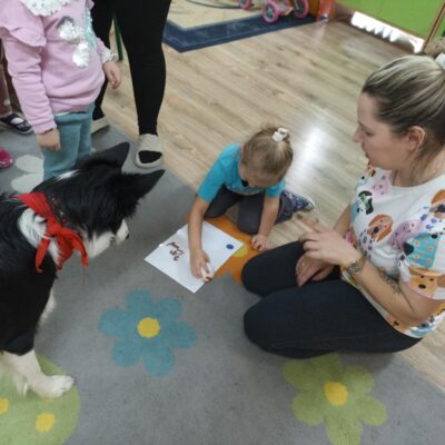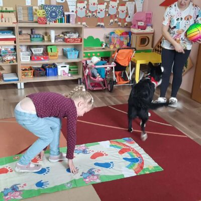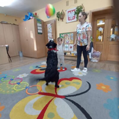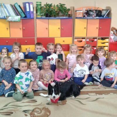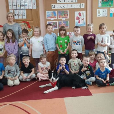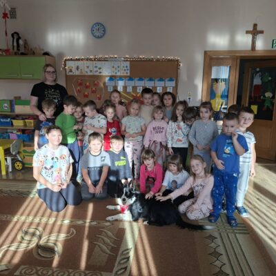 4 grudnia gościliśmy w naszym przedszkolu wyjątkowego gościa. Piesek Kira wraz ze swoją opiekunką odwiedził nasze przedszkolaki. Dzieci zapoznały się z pieskiem oraz dowiedziały, jak należy zachowywać się w obecności psa. Następnie rozpoczęła się wspólna zabawa – maluchy miały za zadanie ukryć dla Kiry smakołyk, a piesek z zaangażowaniem go odszukiwał. Pani opiekunka przeprowadziła również zajęcia edukacyjne z elementami dogoterapii, których celem był wszechstronny rozwój dzieci, dostarczanie pozytywnych bodźców oraz radości z kontaktu z czworonożnym przyjacielem. Dzieci chętnie współpracowały podczas zabaw z pieskiem: wydawały Kirze proste komendy, obserwowały jej reakcje, bawiły się piłką oraz uczestniczyły w ćwiczeniach na specjalnej macie. Podczas praktycznych zajęć przedszkolaki utrwaliły swoją wiedzę dotyczącą właściwego traktowania i opiekowania się zwierzętami. Serdecznie dziękujemy za wizytę i już nie możemy doczekać się następnego spotkania!