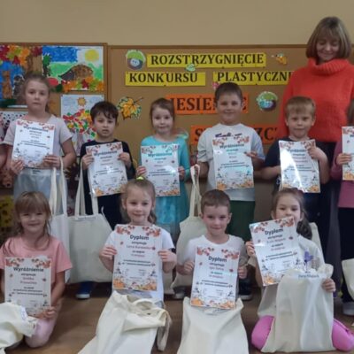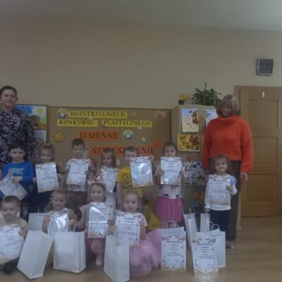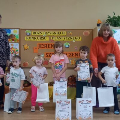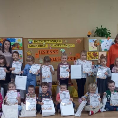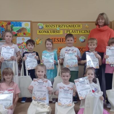 Dziś w naszym przedszkolu odbyło się rozstrzygnięcie konkursu plastycznego „Jesienne szeleszczenie”. Dzieci z wielką niecierpliwością oczekiwały na ogłoszenie wyników, z ciekawością oglądając wszystkie piękne, kolorowe prace konkursowe. Konkurs miał na celu rozwijanie kreatywności przedszkolaków oraz uwrażliwienie ich na piękno jesiennej przyrody. Prace dzieci zachwycały pomysłowością i starannością wykonania, dlatego każde dziecko otrzymało nagrodę oraz pamiątkowy dyplom. Upominki dla laureatów oraz dzieci wyróżnionych wręczyła dyrektor przedszkola, dziękując za udział i wyrażając uznanie dla ich kreatywności oraz zaangażowania. Tego samego dnia, aby uczcić Narodowe Święto Niepodległości, całe przedszkole wzięło udział w ogólnopolskiej akcji „Szkoła do hymnu”. Punktualnie o godzinie 11:11 wszyscy wspólnie zaśpiewaliśmy „Mazurka Dąbrowskiego”, wyrażając w ten sposób nasz patriotyzm i radość z bycia Polakami.