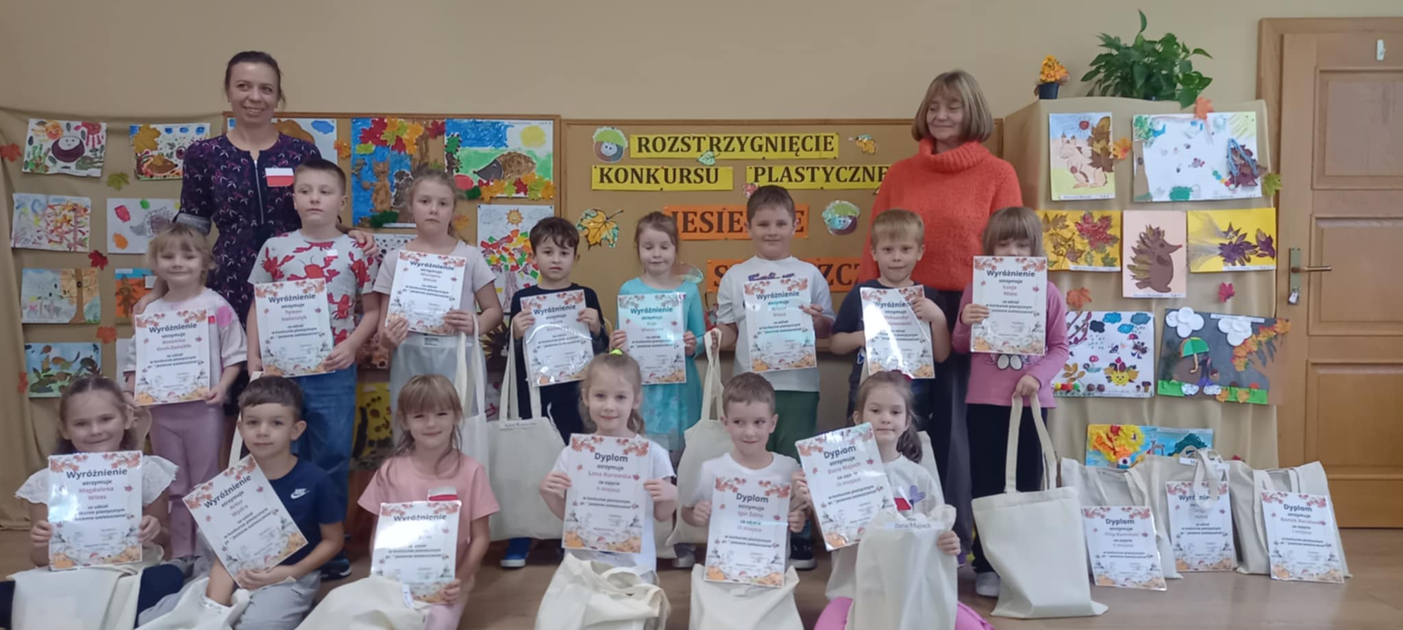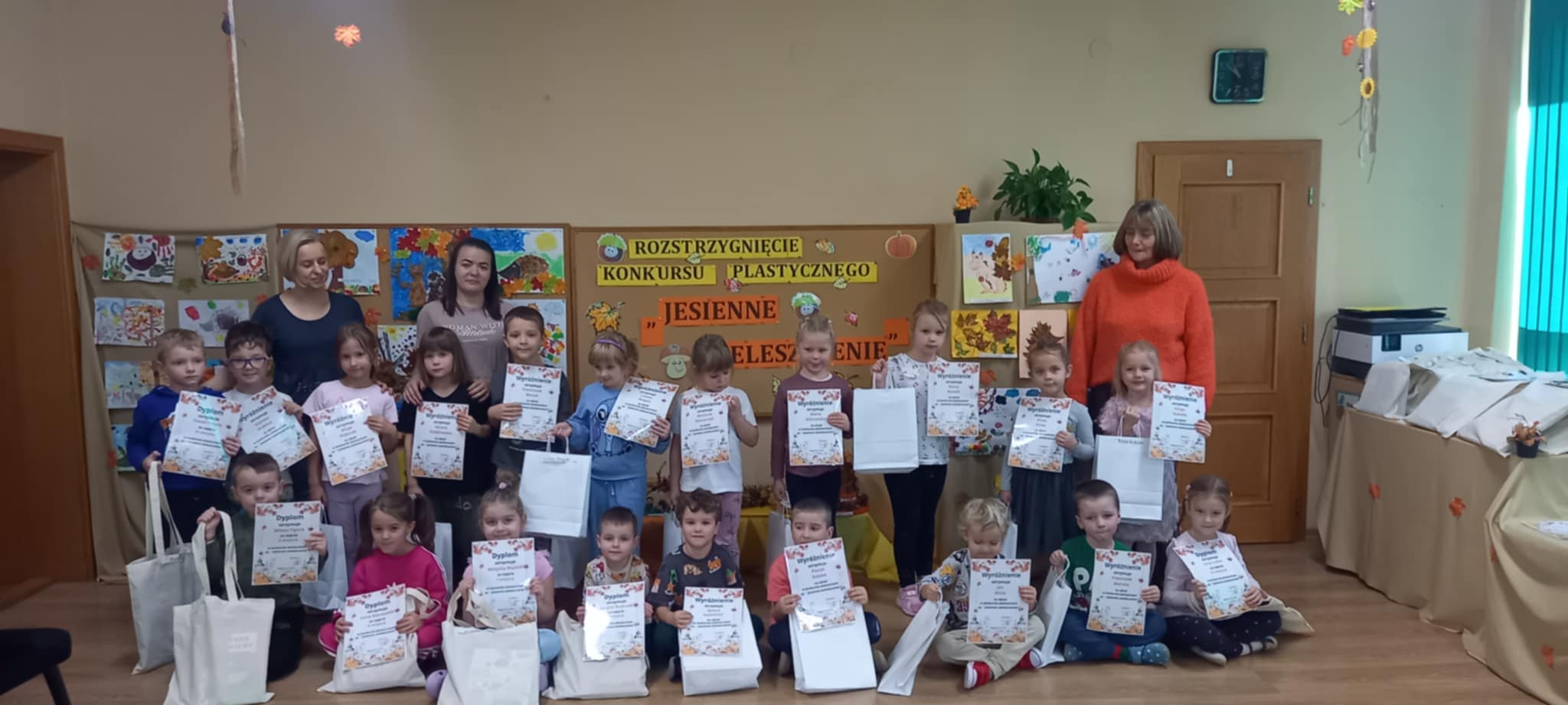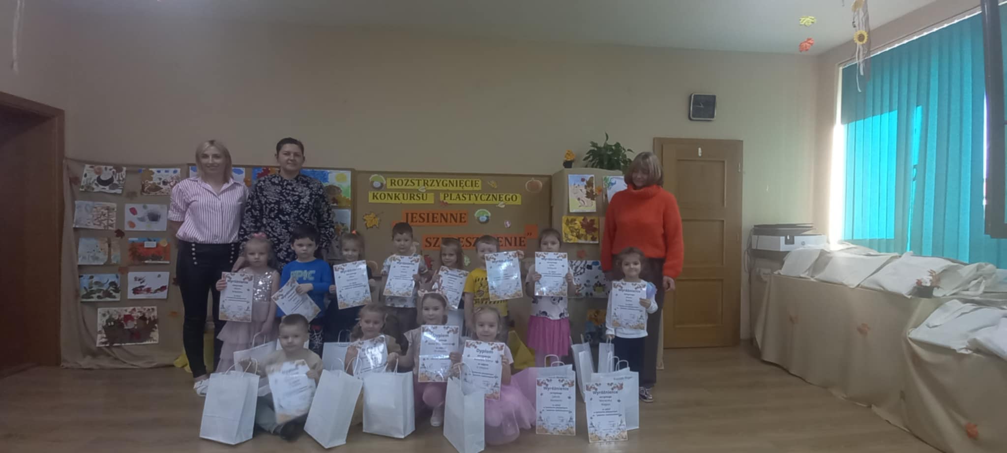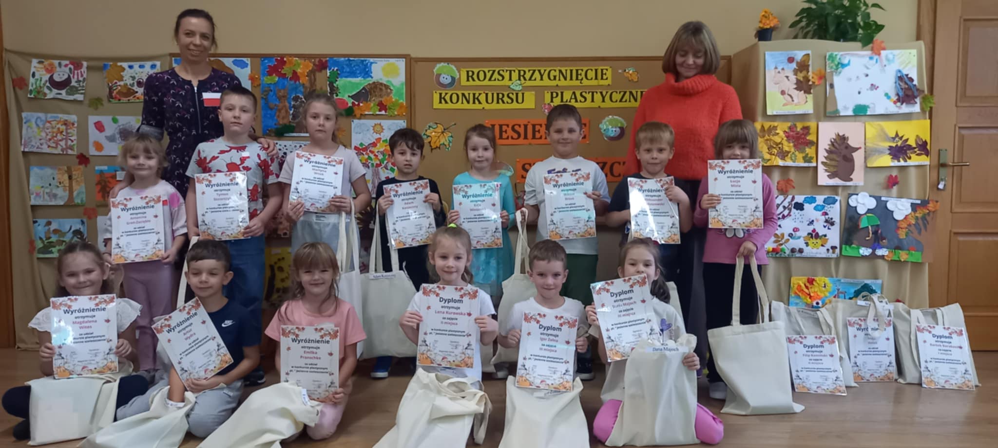 Dziś w naszym przedszkolu odbyło się rozstrzygnięcie konkursu plastycznego „Jesienne szeleszczenie”. Dzieci z wielką niecierpliwością oczekiwały na ogłoszenie wyników, z ciekawością oglądając wszystkie piękne, kolorowe prace konkursowe. Konkurs miał na celu rozwijanie kreatywności przedszkolaków oraz uwrażliwienie ich na piękno jesiennej przyrody. Prace dzieci zachwycały pomysłowością i starannością wykonania, dlatego każde dziecko otrzymało nagrodę oraz pamiątkowy dyplom. Upominki dla laureatów oraz dzieci wyróżnionych wręczyła dyrektor przedszkola, dziękując za udział i wyrażając uznanie dla ich kreatywności oraz zaangażowania. Tego samego dnia, aby uczcić Narodowe Święto Niepodległości, całe przedszkole wzięło udział w ogólnopolskiej akcji „Szkoła do hymnu”. Punktualnie o godzinie 11:11 wszyscy wspólnie zaśpiewaliśmy „Mazurka Dąbrowskiego”, wyrażając w ten sposób nasz patriotyzm i radość z bycia Polakami.