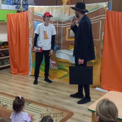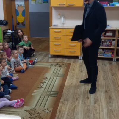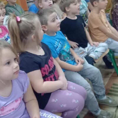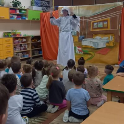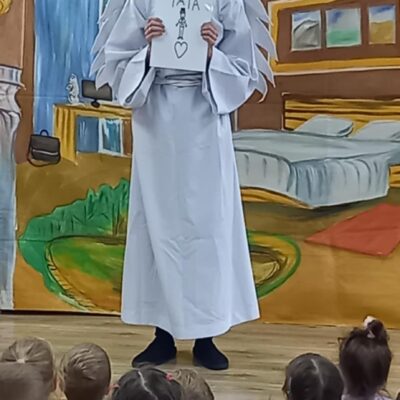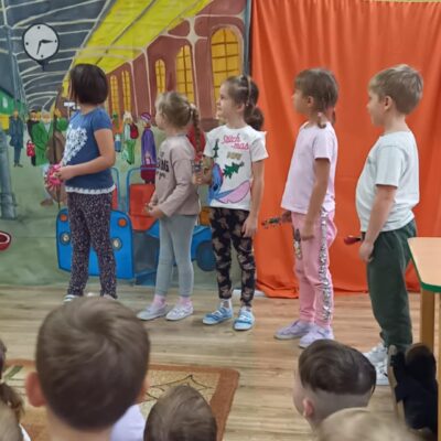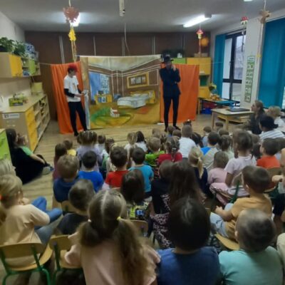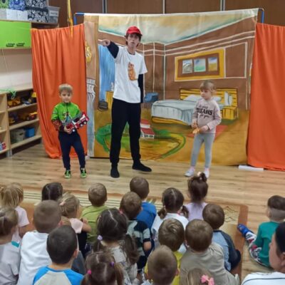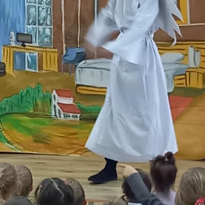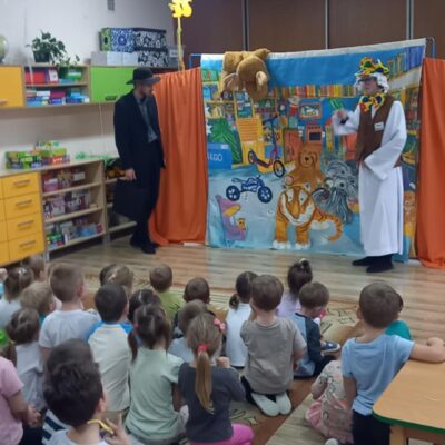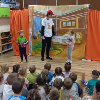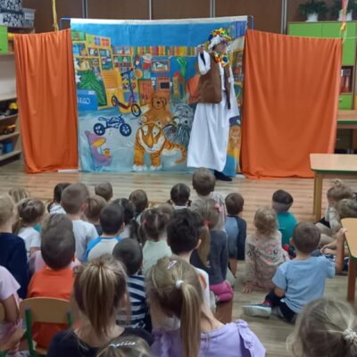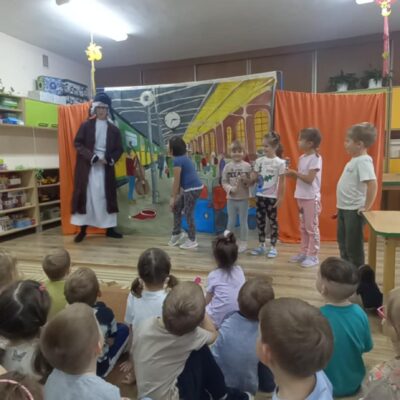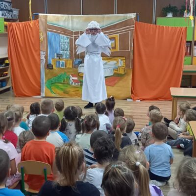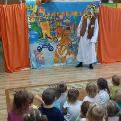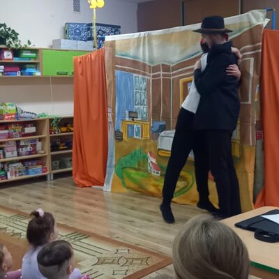 Dziś nasze przedszkole odwiedził Teatr Eden z Wieliczki z pięknym i pełnym wartości spektaklem pt. „Najpiękniejszy prezent”. Dzieci z dużym zainteresowaniem śledziły losy bohaterów, a barwne stroje, muzyka i wyjątkowa atmosfera sprawiły, że przedstawienie dostarczyło wielu wzruszeń i radości. Sztuka opowiada poruszającą historię Piotrusia, który z ogromnym entuzjazmem wyczekuje swoich urodzin. Marzy o tym, by spędzić ten dzień z ukochanym tatą – bardzo zapracowanym, ale niezwykle ważnym w jego życiu. Niestety, pod wpływem decyzji przełożonego, tata musi wrócić do pracy i opuszcza synka w tak ważnej chwili. Piotruś nie pragnął drogich prezentów ani nowych zabawek. Największym marzeniem chłopca było to, by tata choć na moment zatrzymał się w codziennym pośpiechu i podarował mu swój czas i uwagę. Na pomoc Piotrusiowi przychodzą niezwykli bohaterowie – pełni energii, humoru i dobrego serca – którzy robią wszystko, by odmienić bieg wydarzeń i przywrócić radość urodzinowego święta. Spektakl, pełen zwrotów akcji i emocjonujących momentów, przypomniał zarówno dzieciom, jak i dorosłym, że najcenniejszym prezentem, jaki możemy podarować drugiej osobie, jest wspólnie spędzony czas, a dobro i życzliwość mają większą wartość niż jakiekolwiek rzeczy materialne. Mali widzowie chętnie angażowali się w przedstawienie i z entuzjazmem reagowali na interakcje z aktorami. Serdecznie dziękujemy Teatrowi Eden za ten wyjątkowy, wartościowy występ i już teraz zapraszamy ponownie!