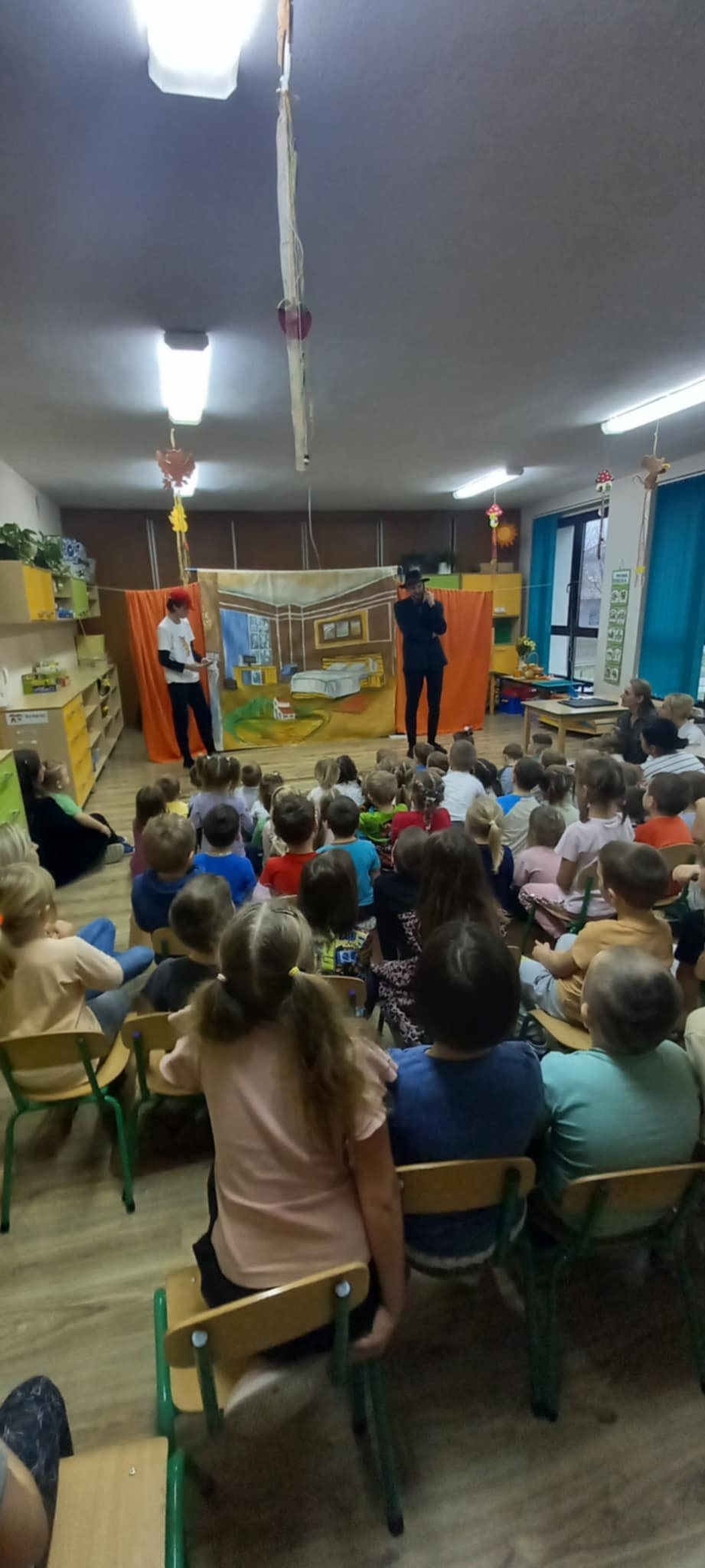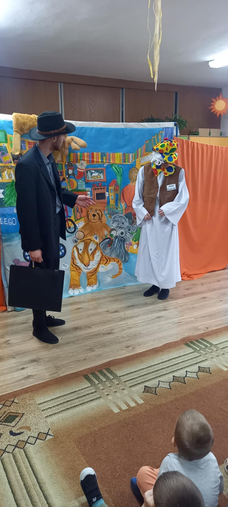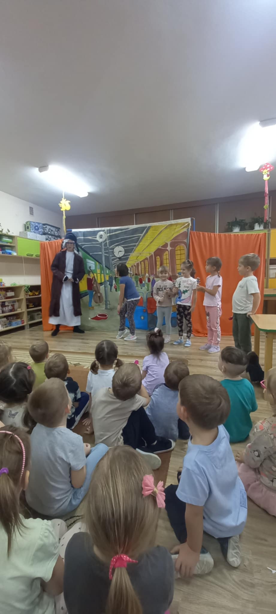 Dziś nasze przedszkole odwiedził Teatr Eden z Wieliczki z pięknym i pełnym wartości spektaklem pt. „Najpiękniejszy prezent”. Dzieci z dużym zainteresowaniem śledziły losy bohaterów, a barwne stroje, muzyka i wyjątkowa atmosfera sprawiły, że przedstawienie dostarczyło wielu wzruszeń i radości. Sztuka opowiada poruszającą historię Piotrusia, który z ogromnym entuzjazmem wyczekuje swoich urodzin. Marzy o tym, by spędzić ten dzień z ukochanym tatą – bardzo zapracowanym, ale niezwykle ważnym w jego życiu. Niestety, pod wpływem decyzji przełożonego, tata musi wrócić do pracy i opuszcza synka w tak ważnej chwili. Piotruś nie pragnął drogich prezentów ani nowych zabawek. Największym marzeniem chłopca było to, by tata choć na moment zatrzymał się w codziennym pośpiechu i podarował mu swój czas i uwagę. Na pomoc Piotrusiowi przychodzą niezwykli bohaterowie – pełni energii, humoru i dobrego serca – którzy robią wszystko, by odmienić bieg wydarzeń i przywrócić radość urodzinowego święta. Spektakl, pełen zwrotów akcji i emocjonujących momentów, przypomniał zarówno dzieciom, jak i dorosłym, że najcenniejszym prezentem, jaki możemy podarować drugiej osobie, jest wspólnie spędzony czas, a dobro i życzliwość mają większą wartość niż jakiekolwiek rzeczy materialne. Mali widzowie chętnie angażowali się w przedstawienie i z entuzjazmem reagowali na interakcje z aktorami. Serdecznie dziękujemy Teatrowi Eden za ten wyjątkowy, wartościowy występ i już teraz zapraszamy ponownie!