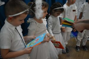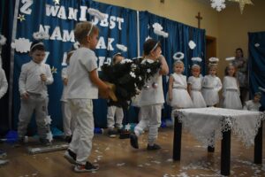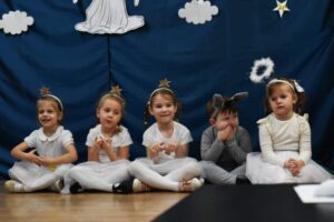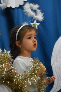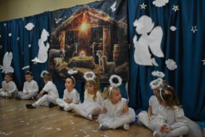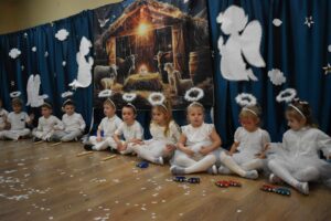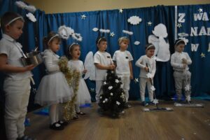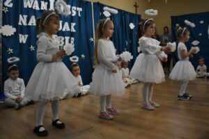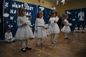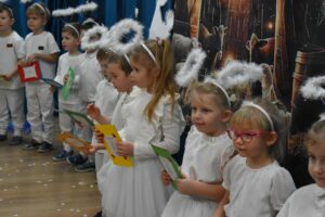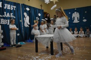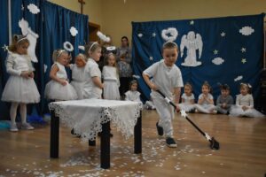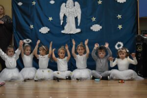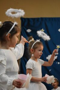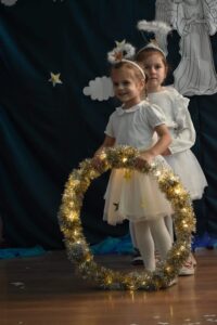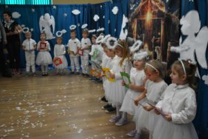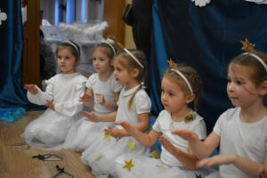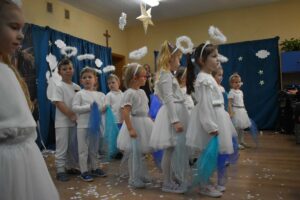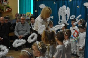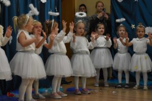 W dniu 16 stycznia dzieci z grupy Jeżyki wystąpiły dla swoich ukochanych Babć i Dziadków, przygotowując wyjątkowe, świąteczne przedstawienie. Mali artyści, zamieniając się w aniołki przygotowujące się do świąt, z wielkim zaangażowaniem i radością zaprezentowali swój występ, który poruszył serca wszystkich obecnych.