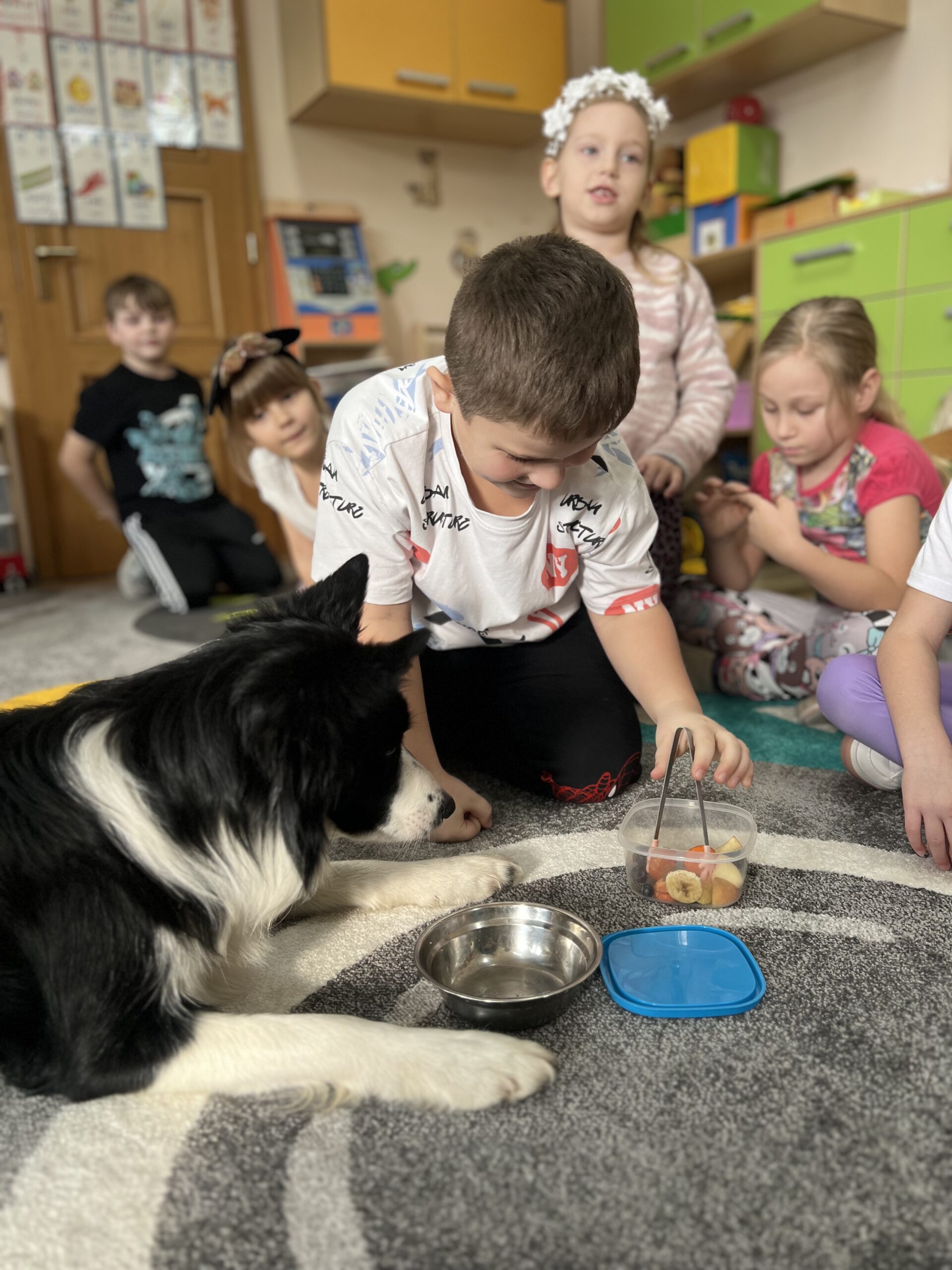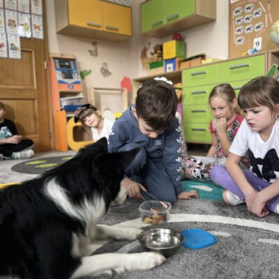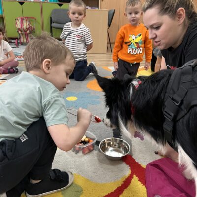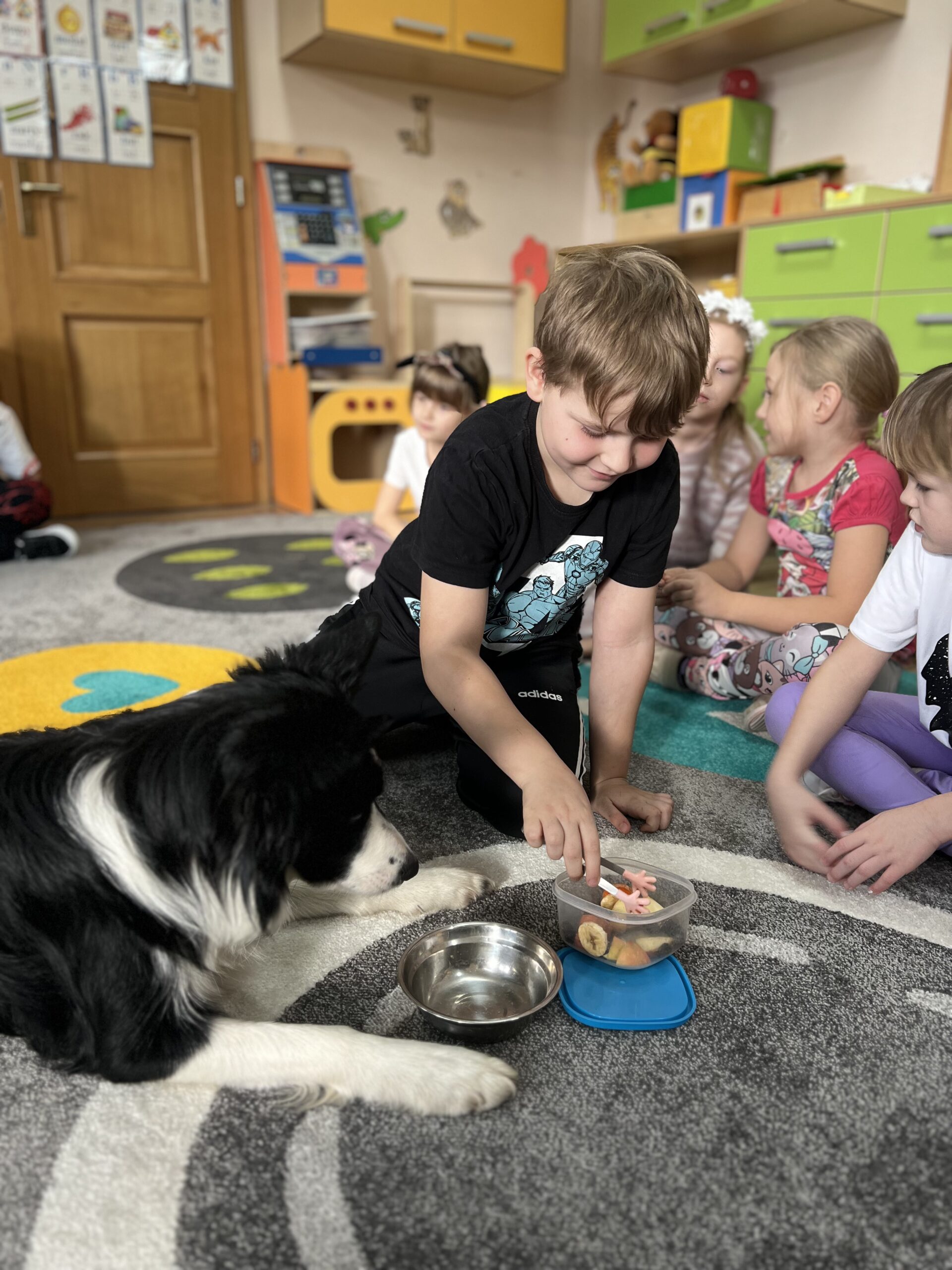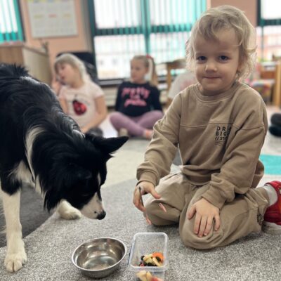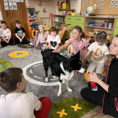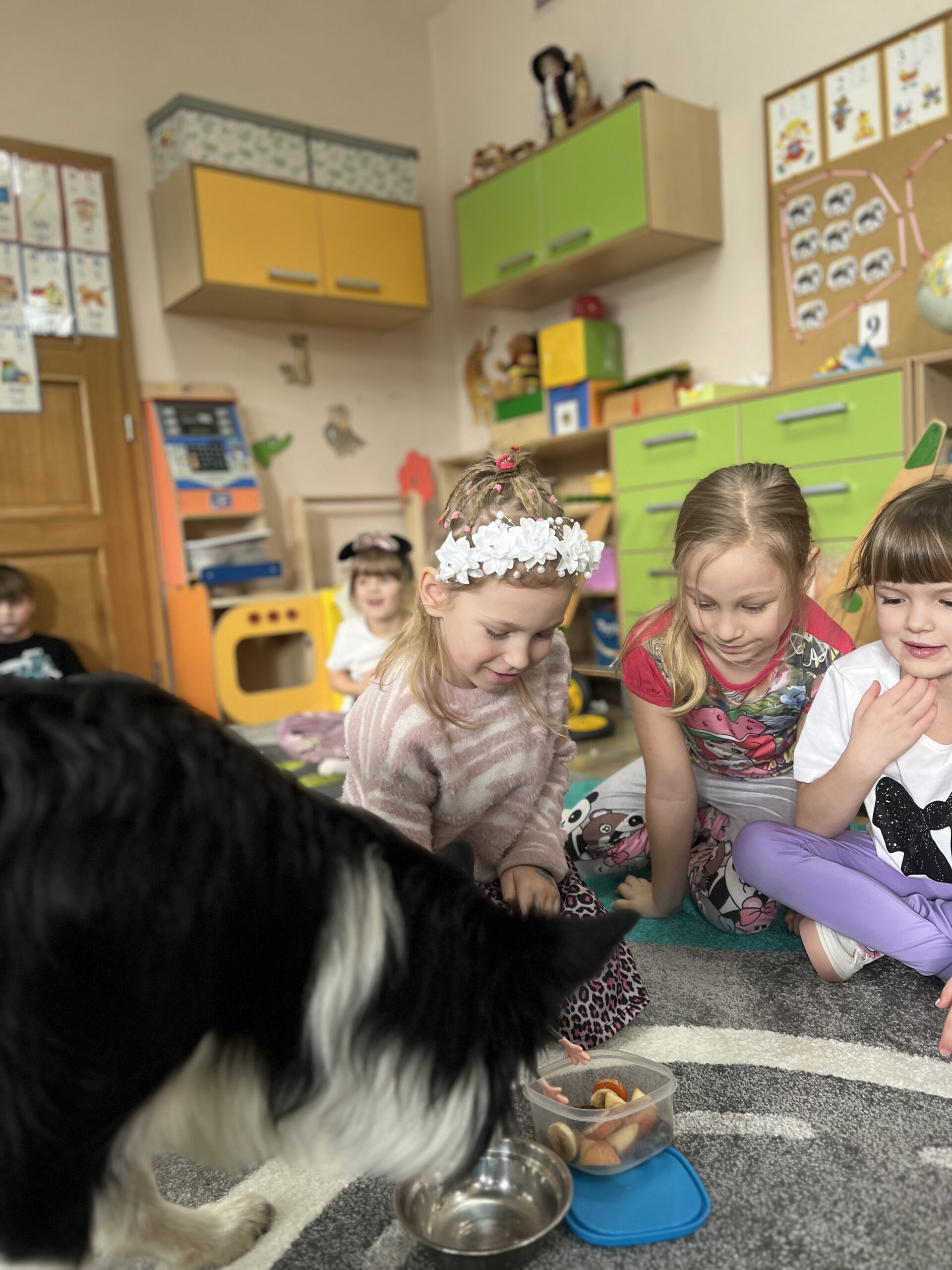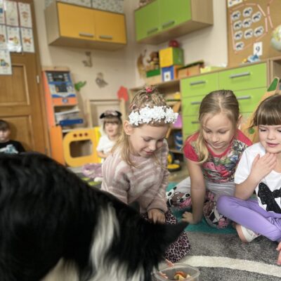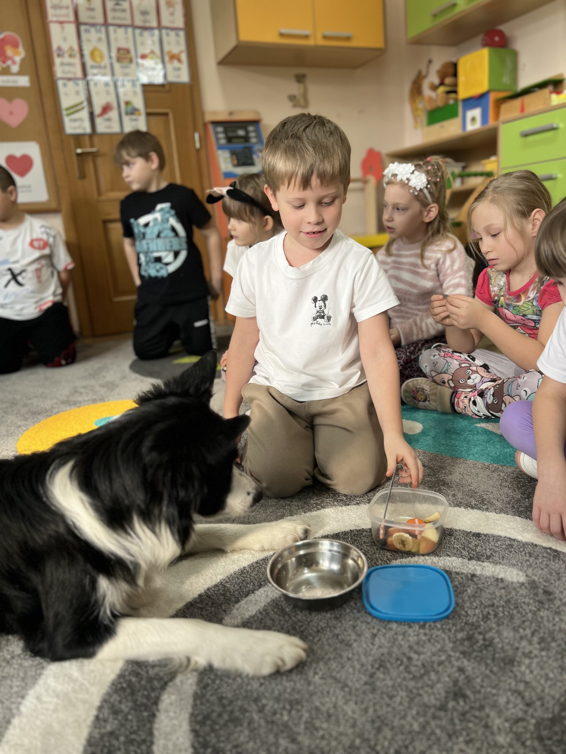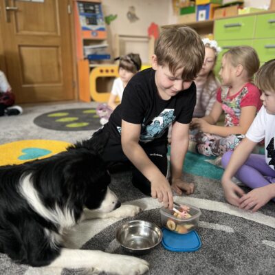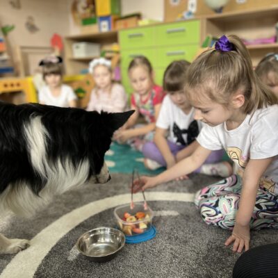 Dzieci miały okazję spotkać się z uroczą pieską Kirą, z którą nie tylko świetnie się bawiły, ale także zdobyły wiele cennych informacji. Tematem przewodnim było zdrowe odżywianie i witaminy – przedszkolaki dowiedziały się, czym możemy karmić pieska, a czego absolutnie nie wolno mu podawać. Teraz już wiedzą, że nie wszystkie smakołyki z naszego talerza są odpowiednie dla czworonogów!