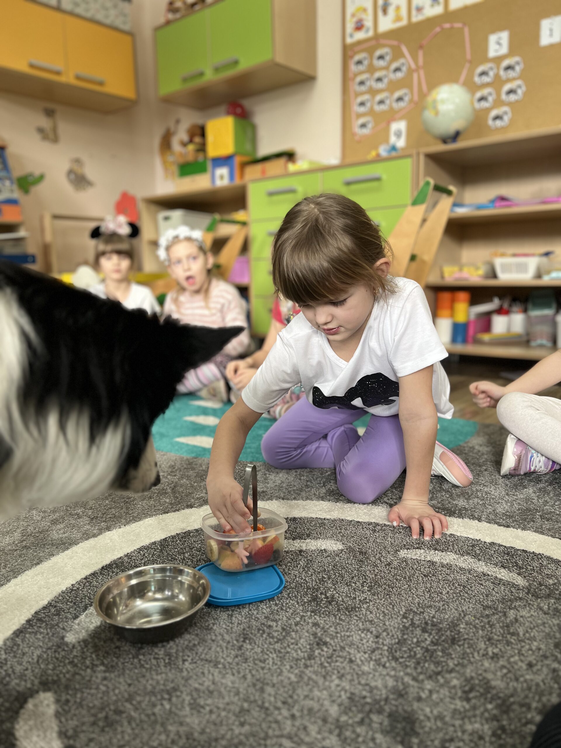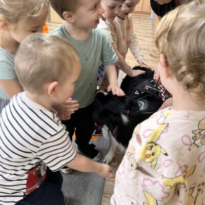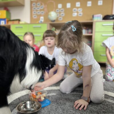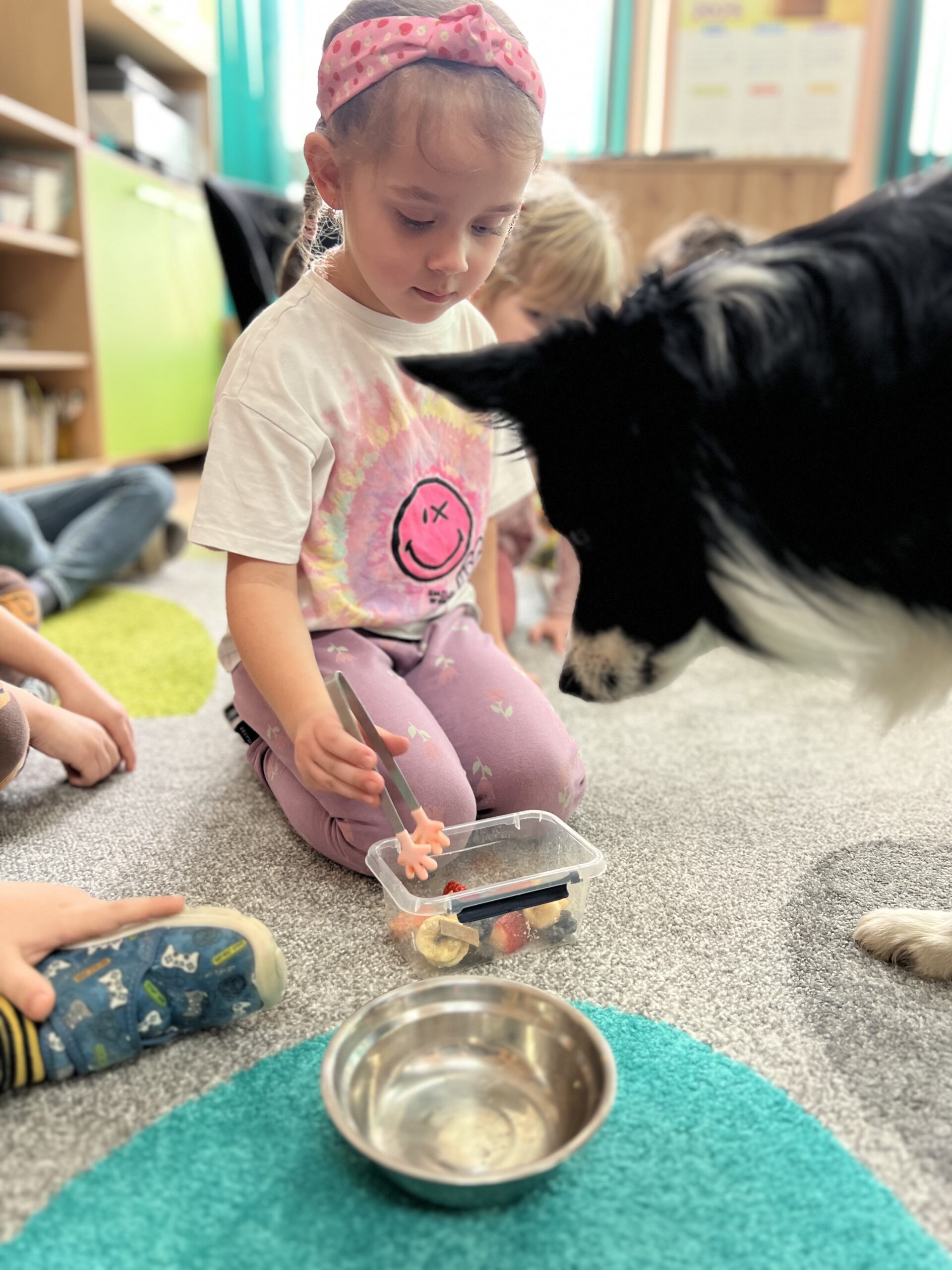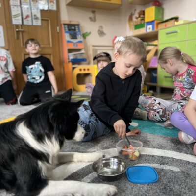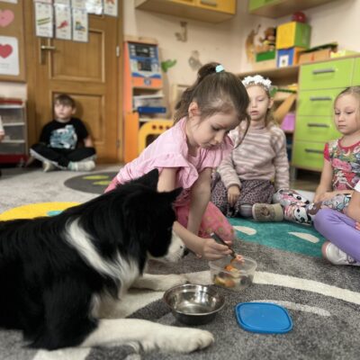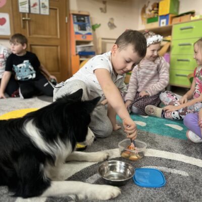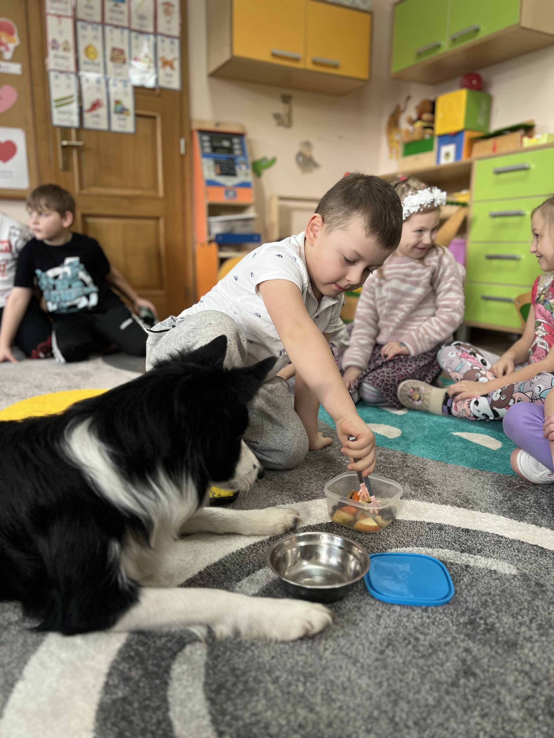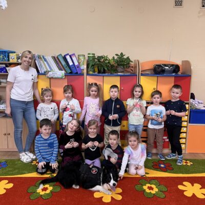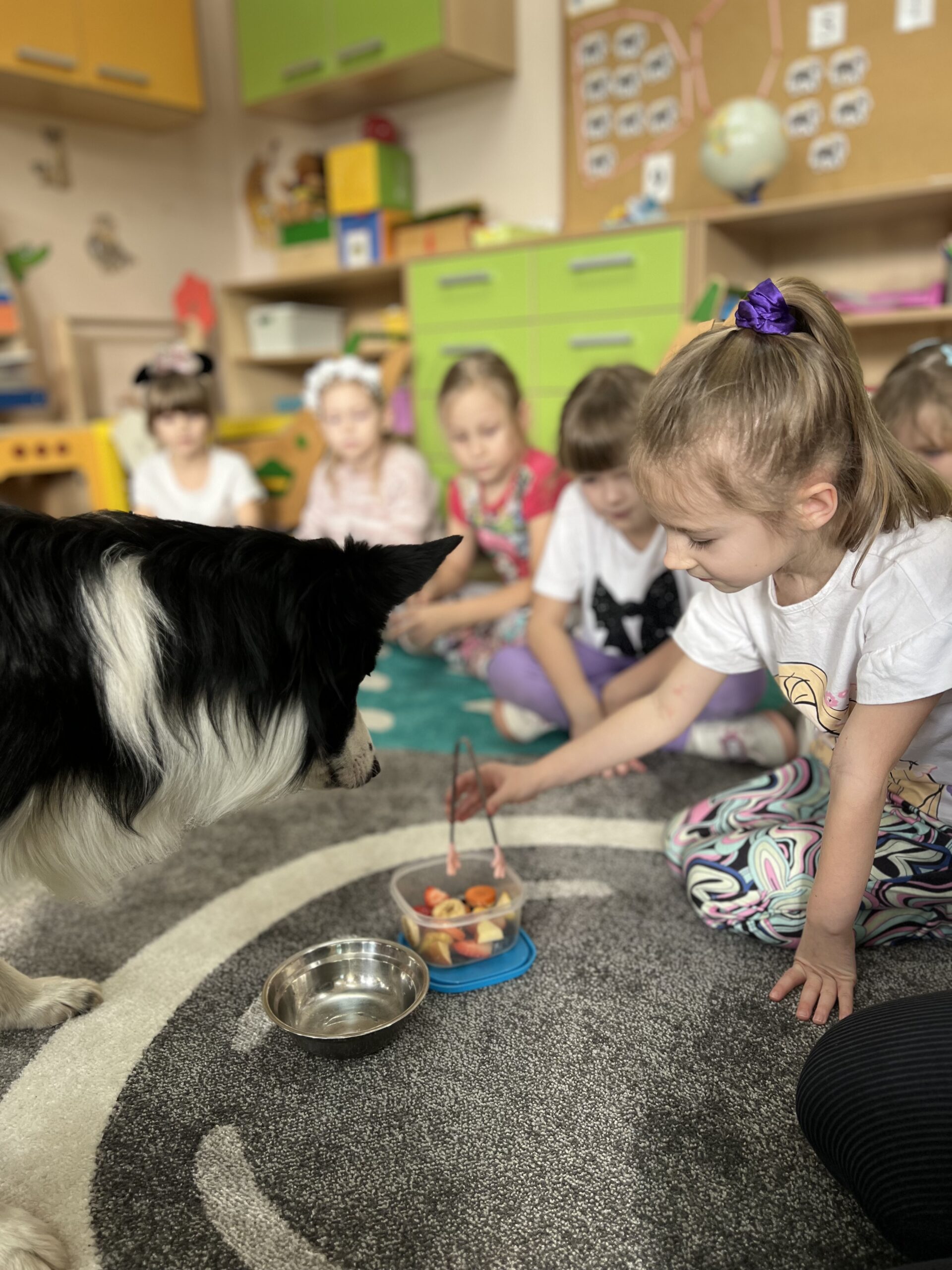 Dzieci miały okazję spotkać się z uroczą pieską Kirą, z którą nie tylko świetnie się bawiły, ale także zdobyły wiele cennych informacji. Tematem przewodnim było zdrowe odżywianie i witaminy – przedszkolaki dowiedziały się, czym możemy karmić pieska, a czego absolutnie nie wolno mu podawać. Teraz już wiedzą, że nie wszystkie smakołyki z naszego talerza są odpowiednie dla czworonogów!