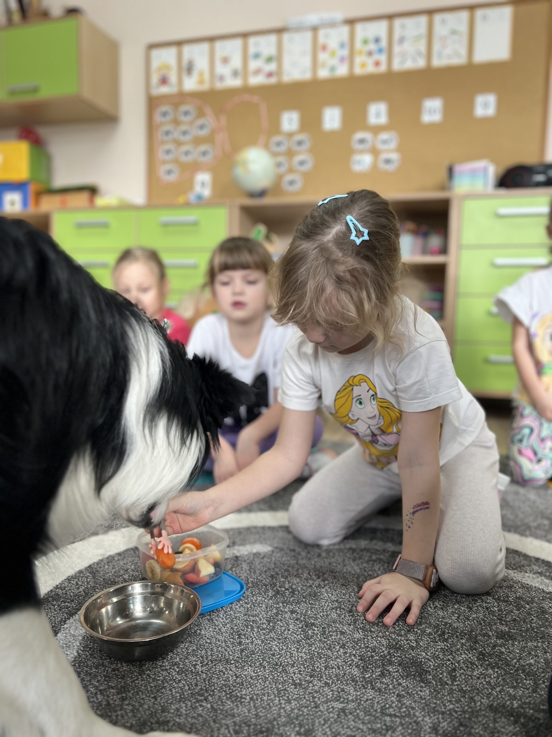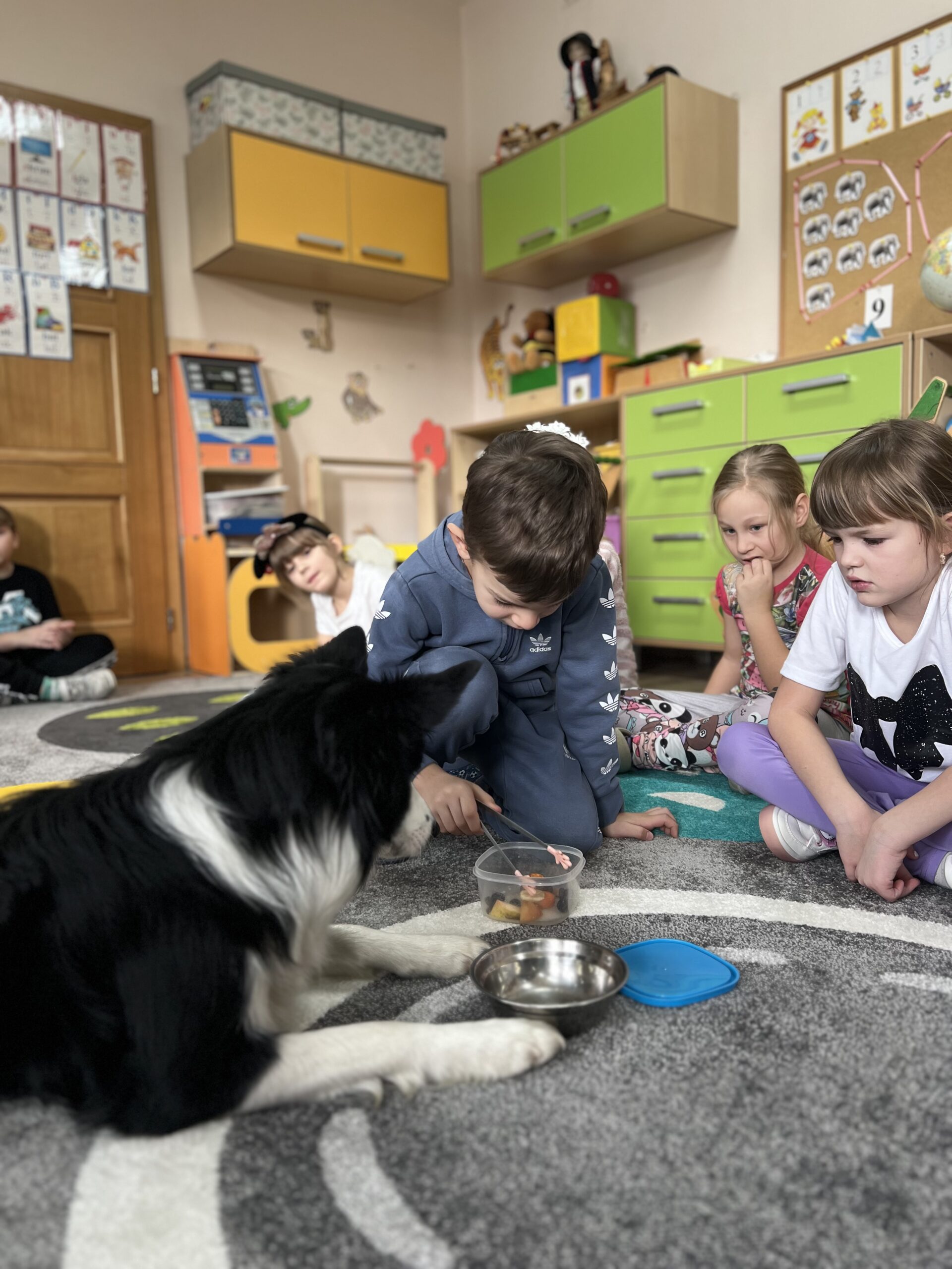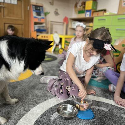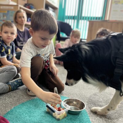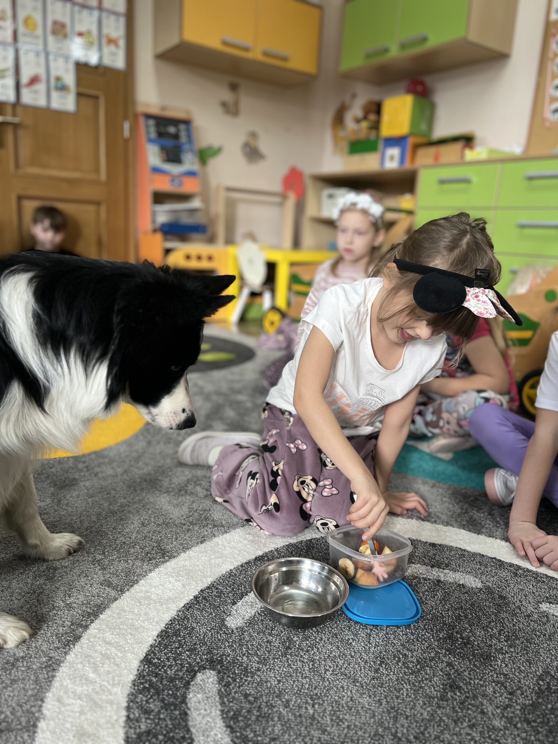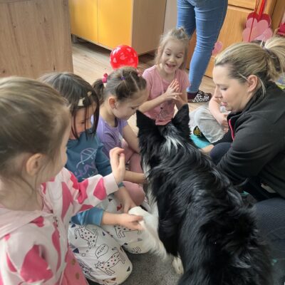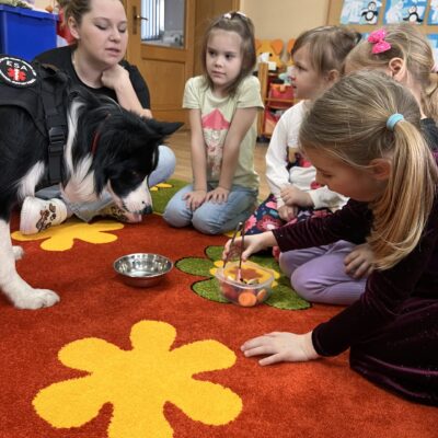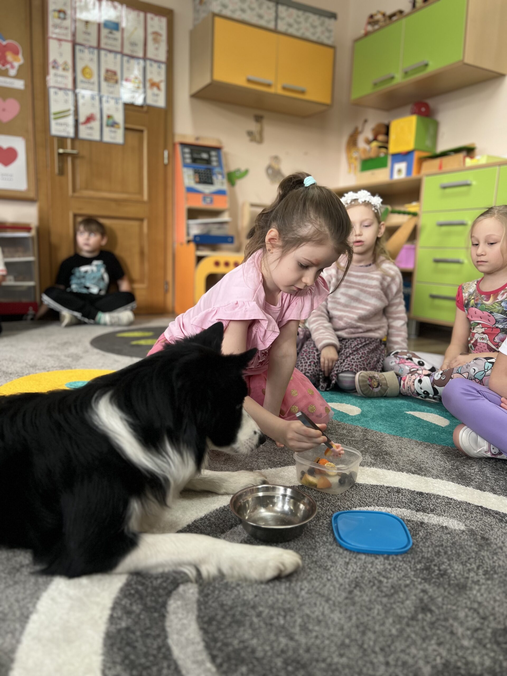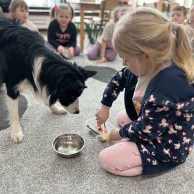 Dzieci miały okazję spotkać się z uroczą pieską Kirą, z którą nie tylko świetnie się bawiły, ale także zdobyły wiele cennych informacji. Tematem przewodnim było zdrowe odżywianie i witaminy – przedszkolaki dowiedziały się, czym możemy karmić pieska, a czego absolutnie nie wolno mu podawać. Teraz już wiedzą, że nie wszystkie smakołyki z naszego talerza są odpowiednie dla czworonogów!