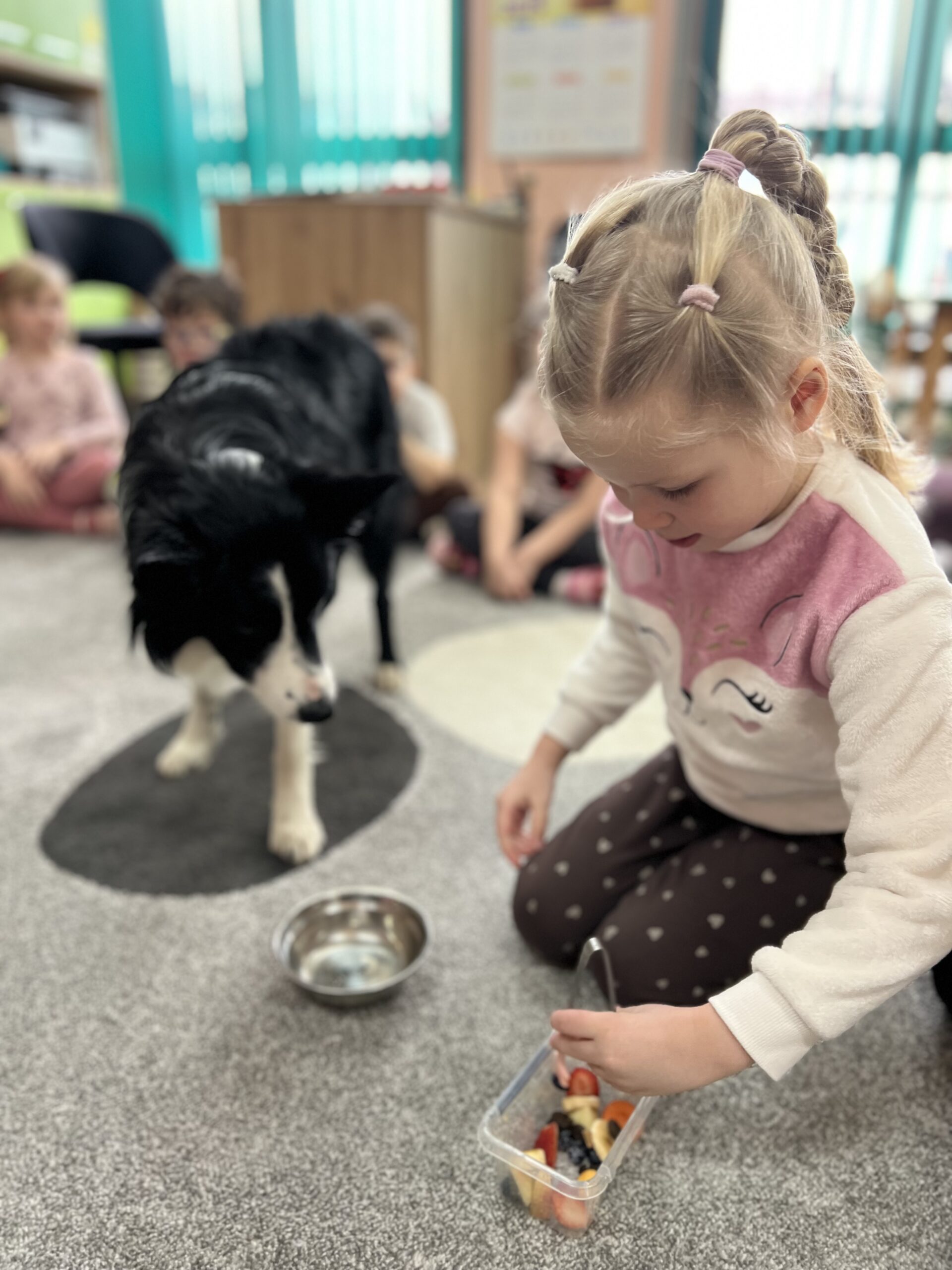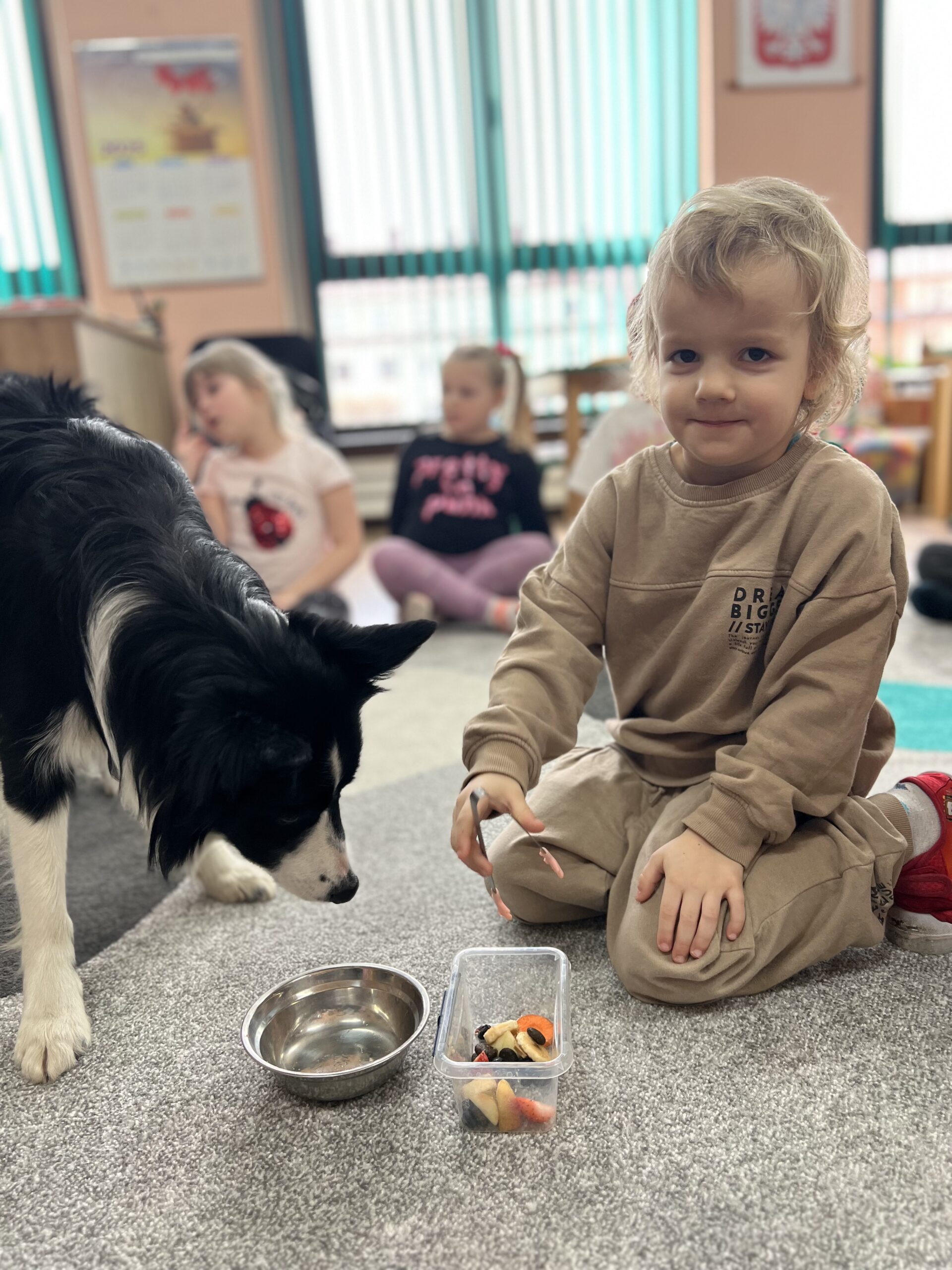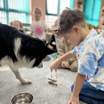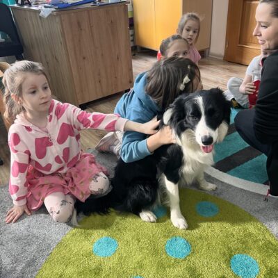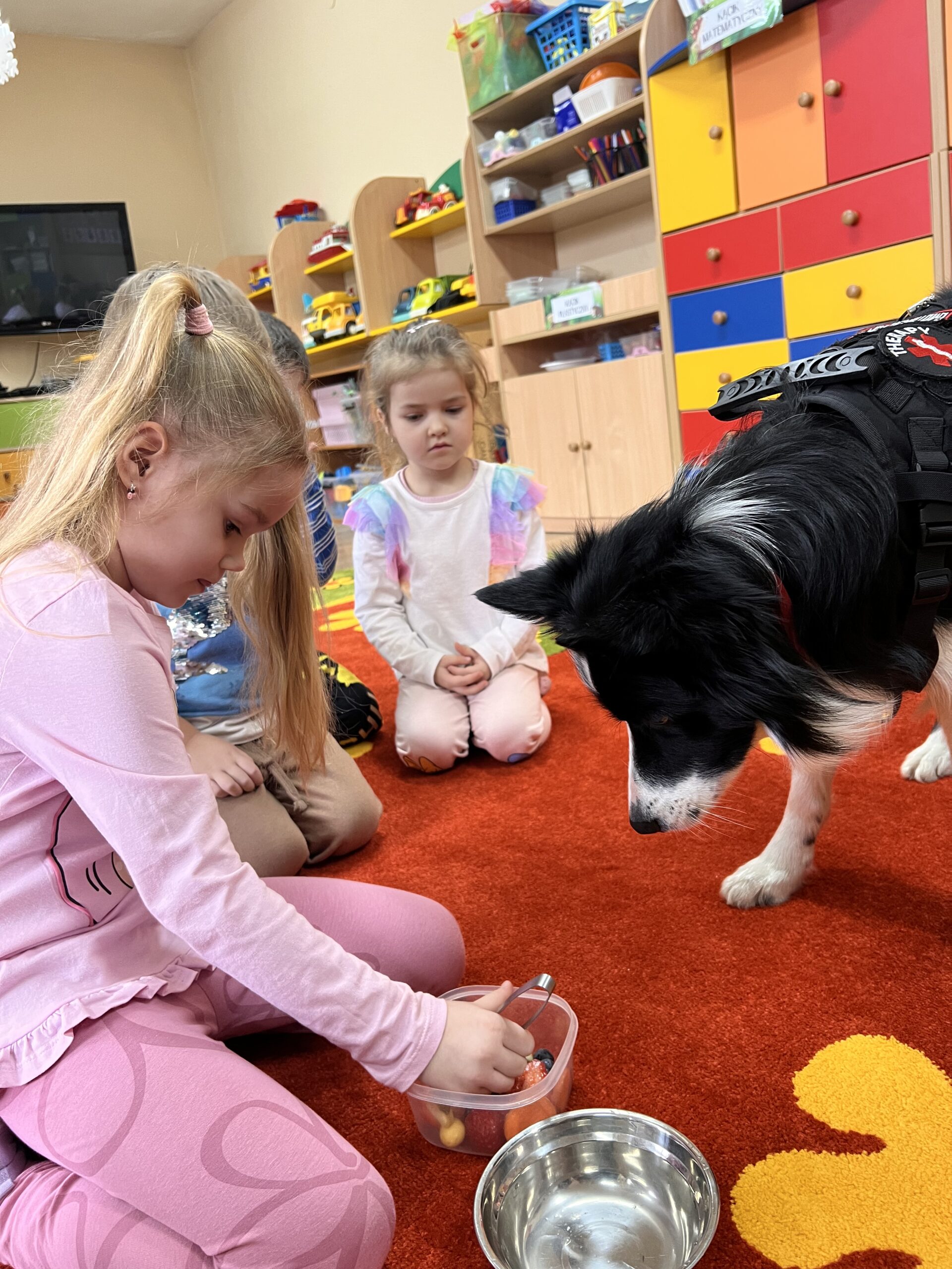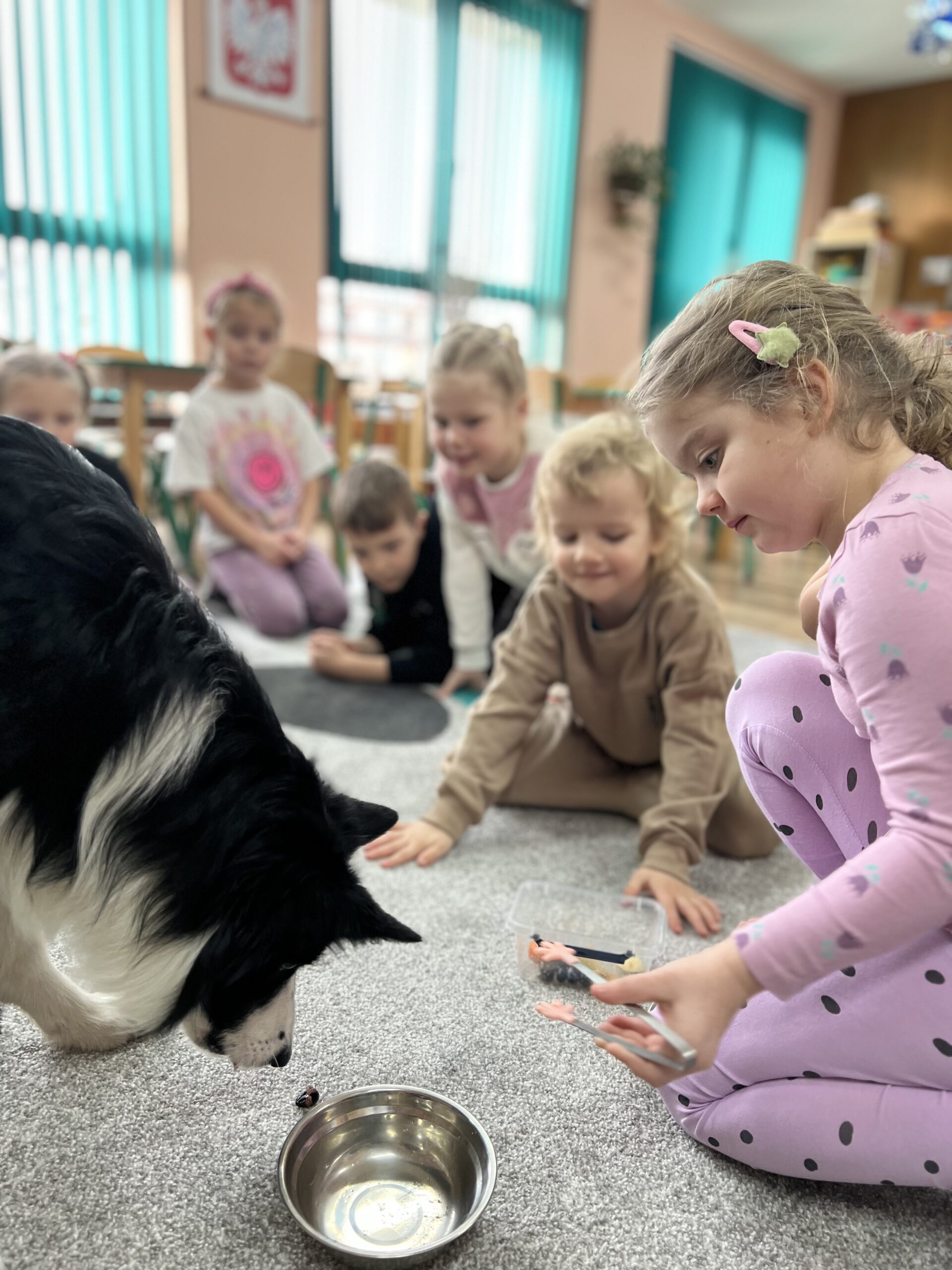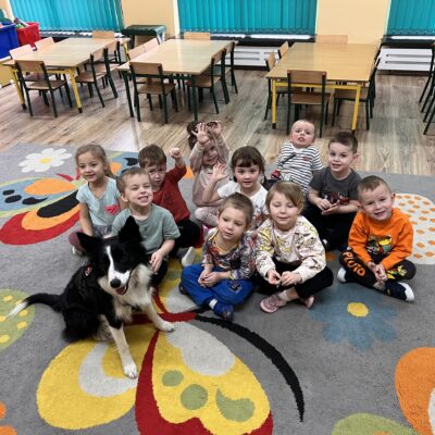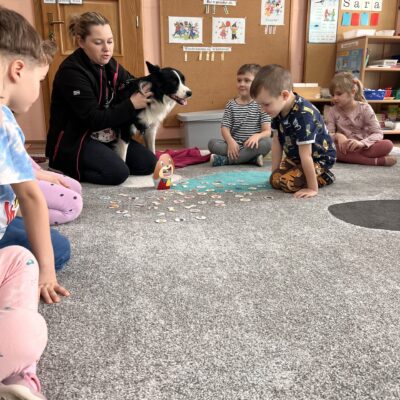 Dzieci miały okazję spotkać się z uroczą pieską Kirą, z którą nie tylko świetnie się bawiły, ale także zdobyły wiele cennych informacji. Tematem przewodnim było zdrowe odżywianie i witaminy – przedszkolaki dowiedziały się, czym możemy karmić pieska, a czego absolutnie nie wolno mu podawać. Teraz już wiedzą, że nie wszystkie smakołyki z naszego talerza są odpowiednie dla czworonogów!