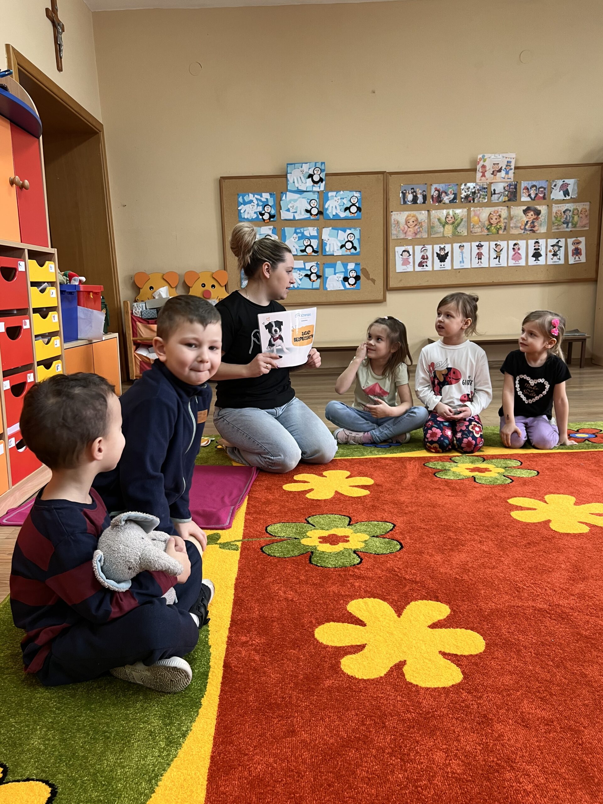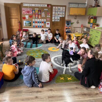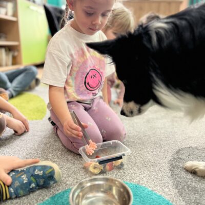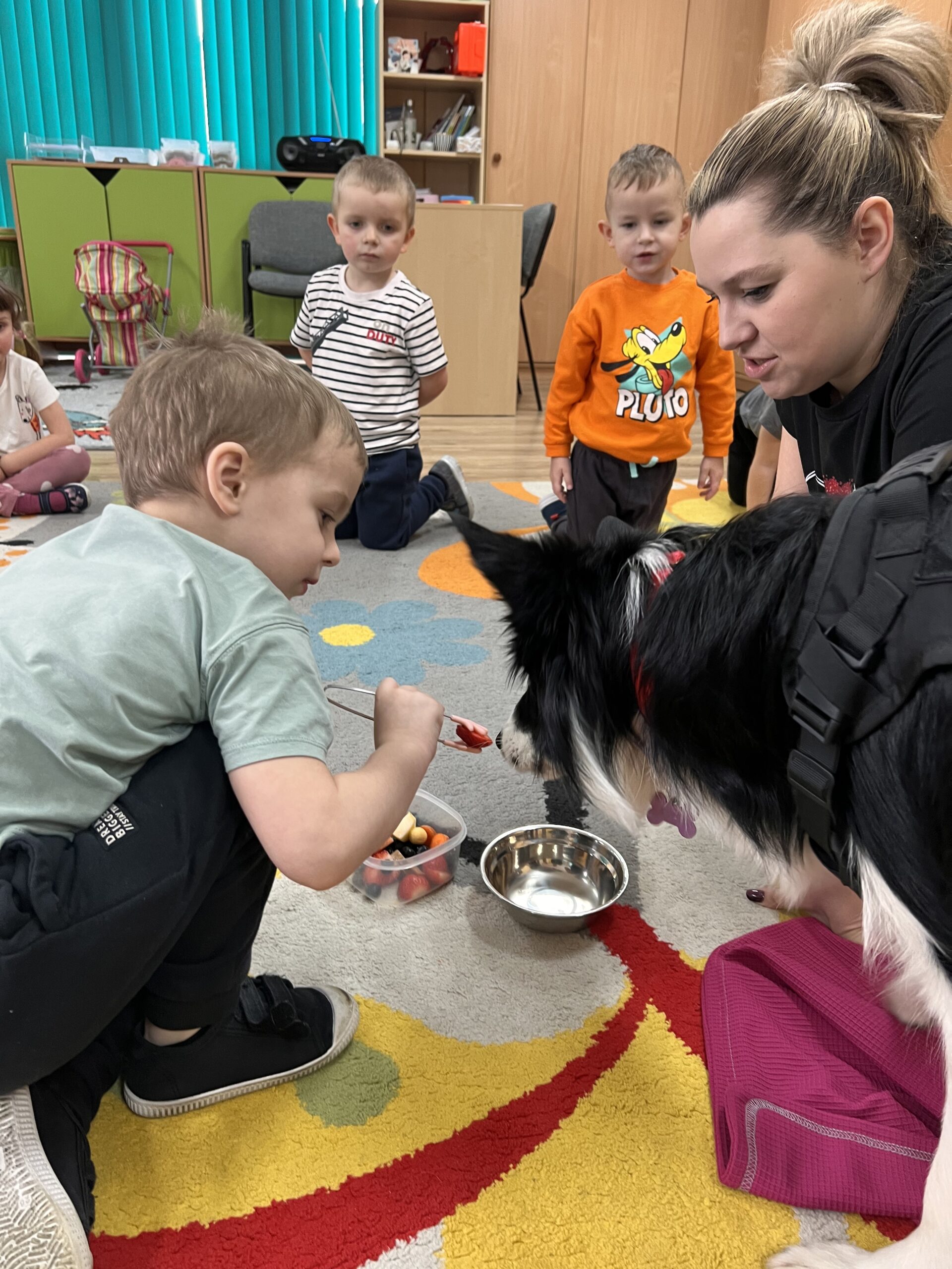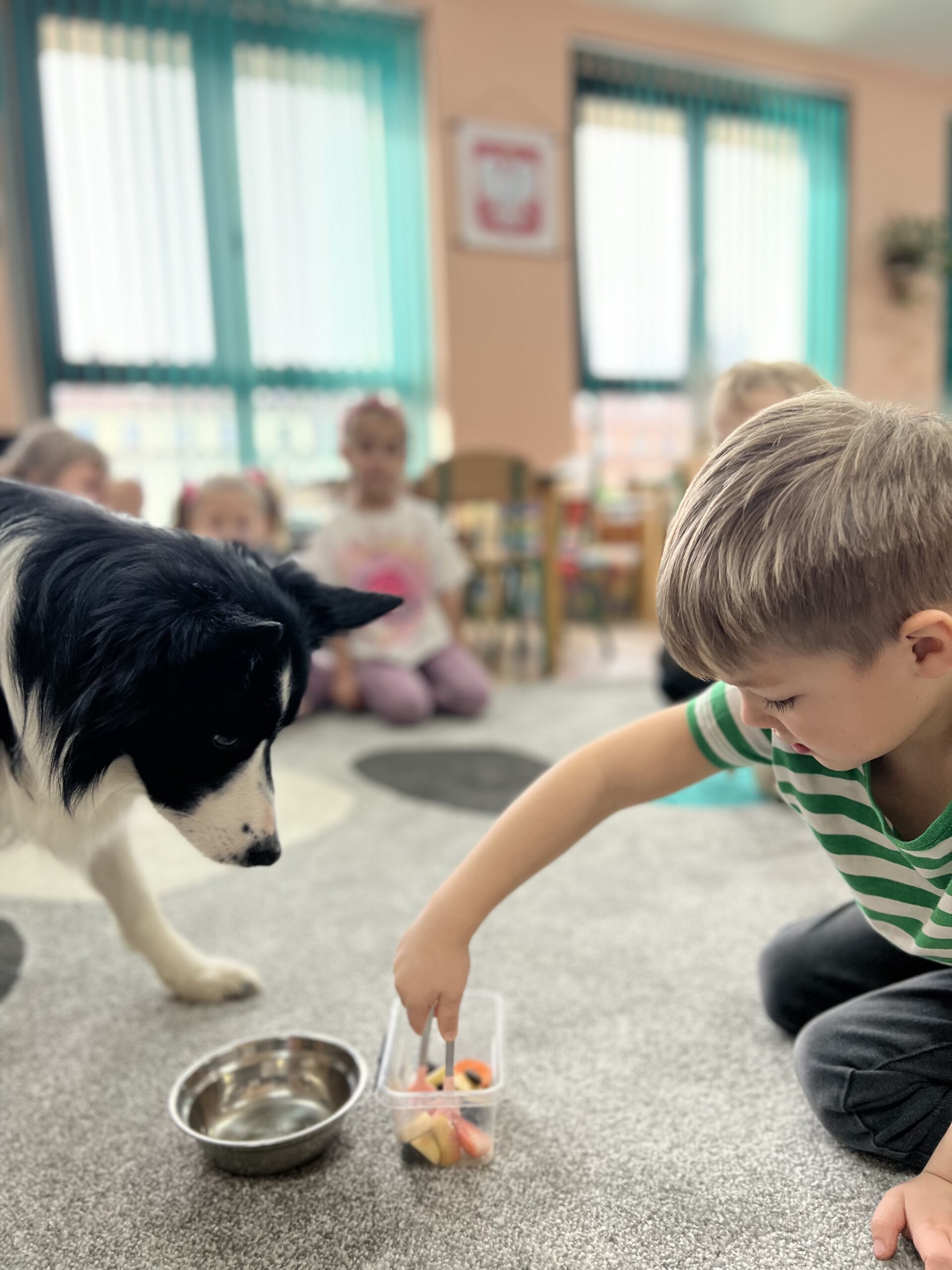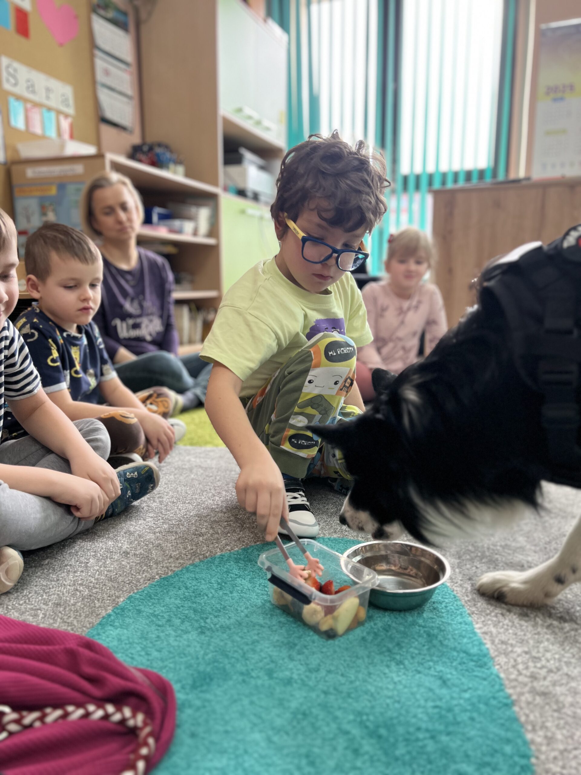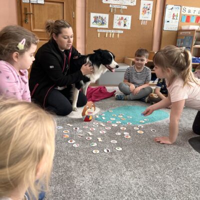 Dzieci miały okazję spotkać się z uroczą pieską Kirą, z którą nie tylko świetnie się bawiły, ale także zdobyły wiele cennych informacji. Tematem przewodnim było zdrowe odżywianie i witaminy – przedszkolaki dowiedziały się, czym możemy karmić pieska, a czego absolutnie nie wolno mu podawać. Teraz już wiedzą, że nie wszystkie smakołyki z naszego talerza są odpowiednie dla czworonogów!