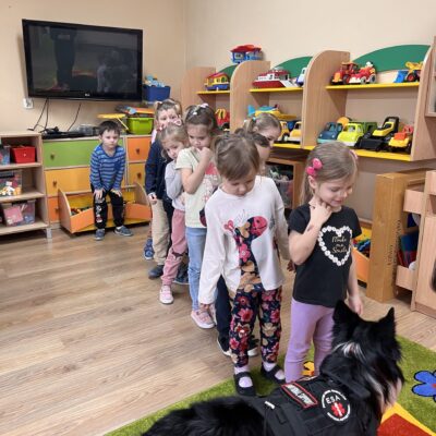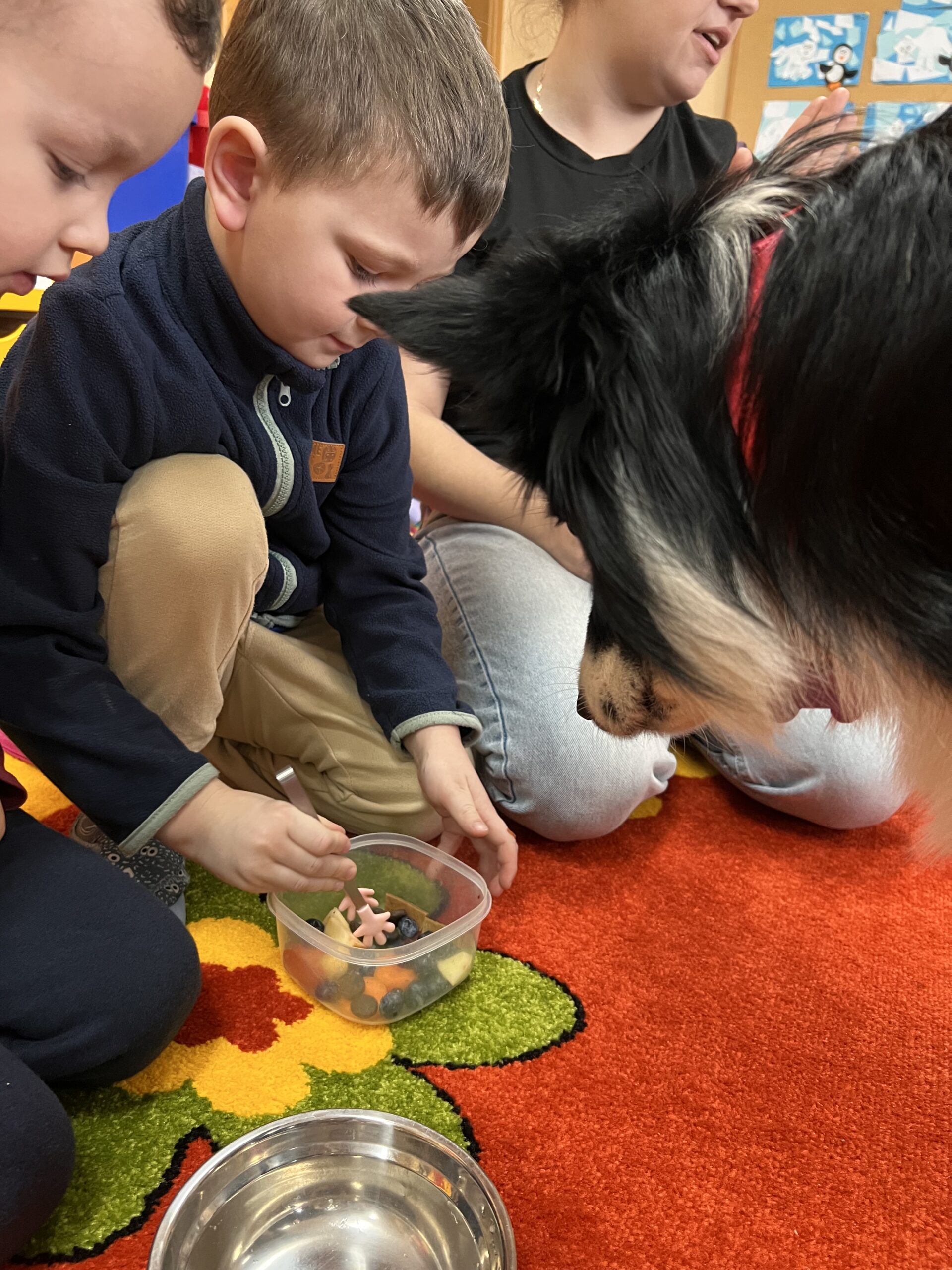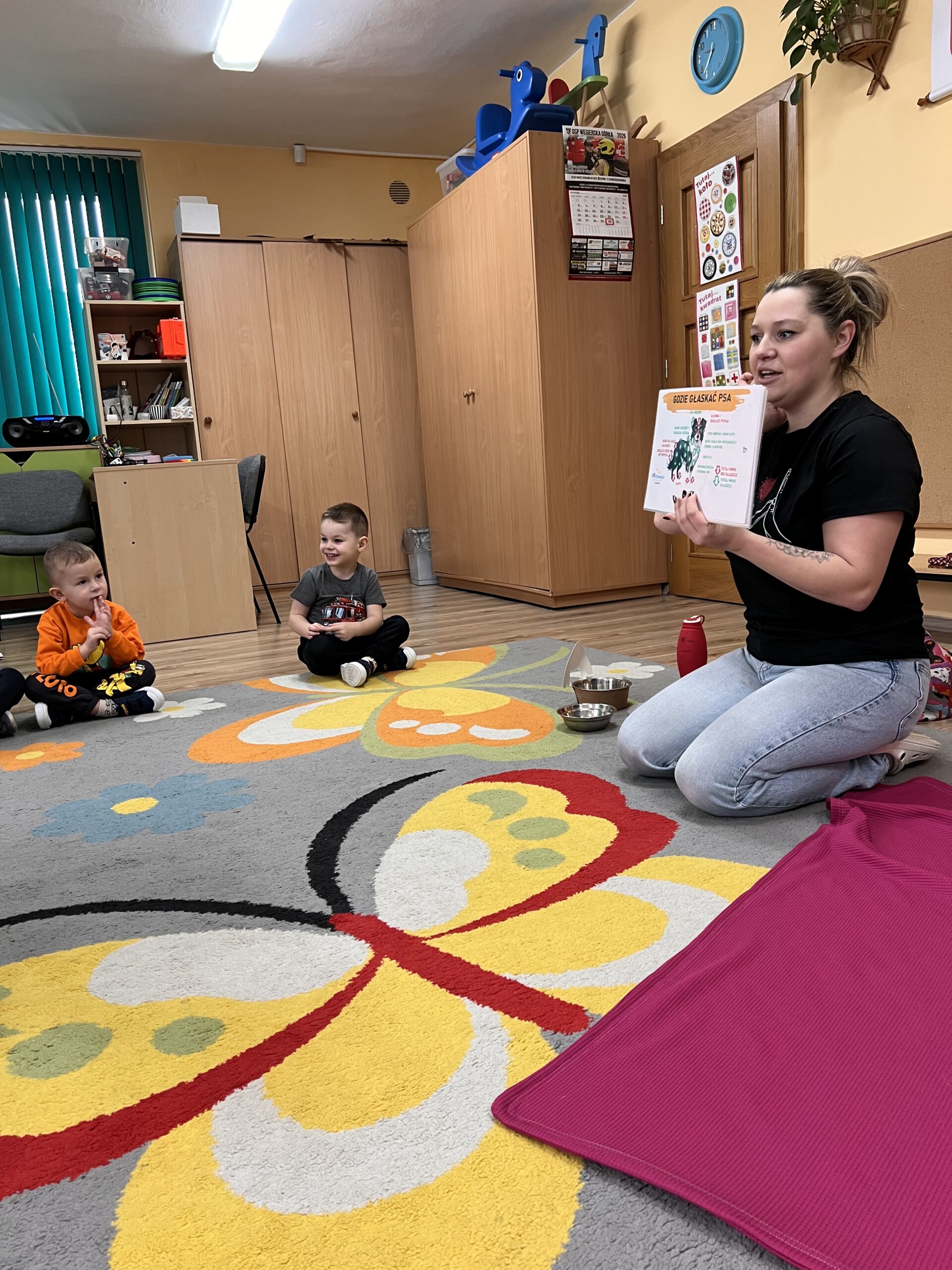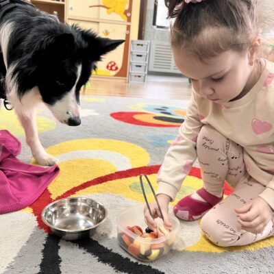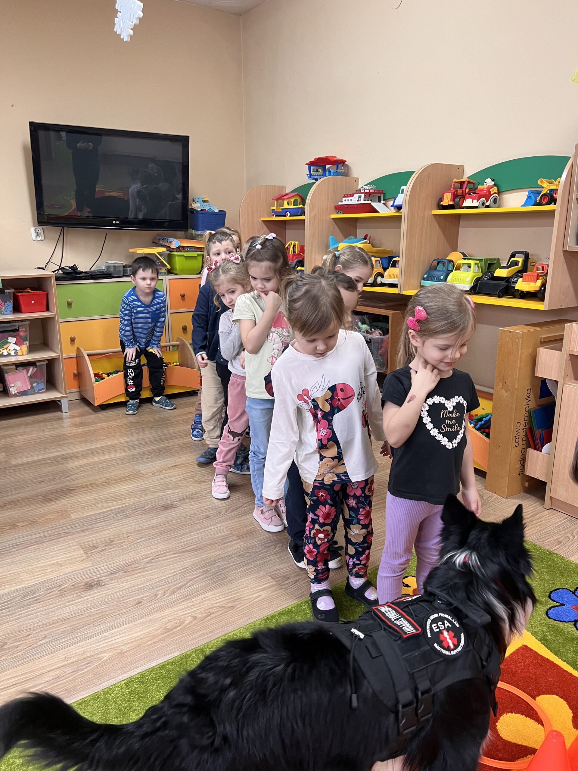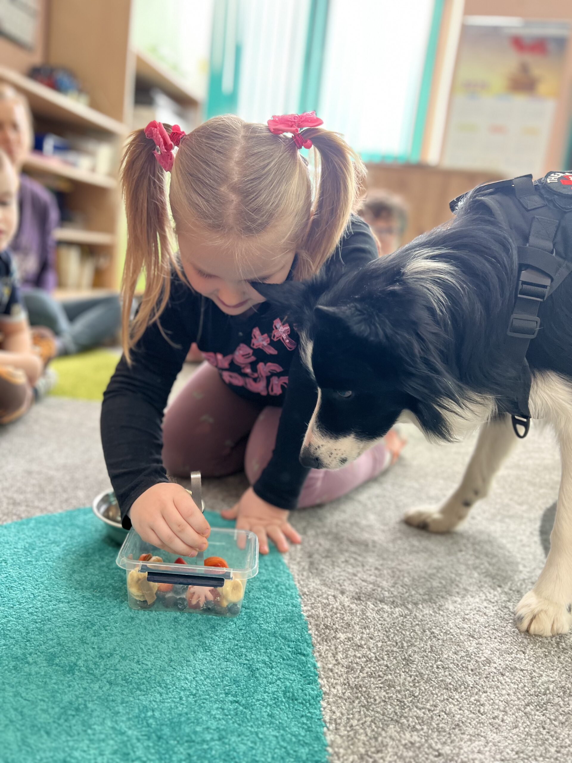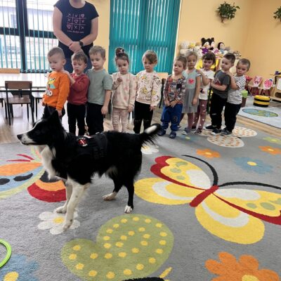 Dzieci miały okazję spotkać się z uroczą pieską Kirą, z którą nie tylko świetnie się bawiły, ale także zdobyły wiele cennych informacji. Tematem przewodnim było zdrowe odżywianie i witaminy – przedszkolaki dowiedziały się, czym możemy karmić pieska, a czego absolutnie nie wolno mu podawać. Teraz już wiedzą, że nie wszystkie smakołyki z naszego talerza są odpowiednie dla czworonogów!