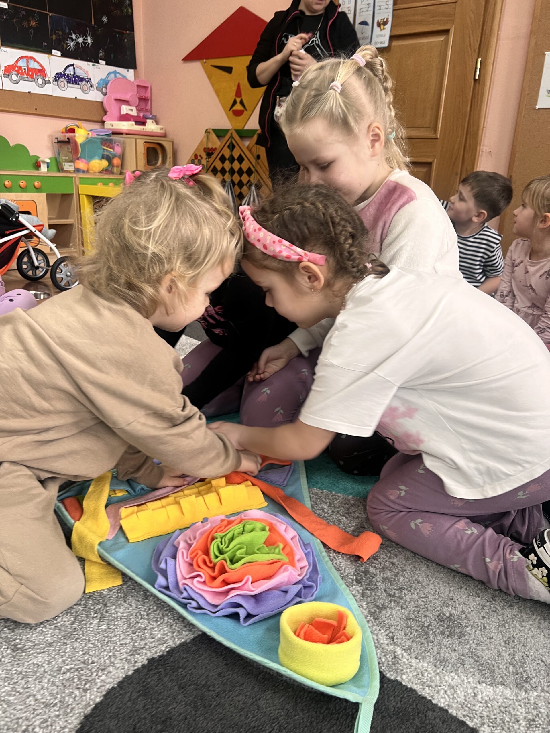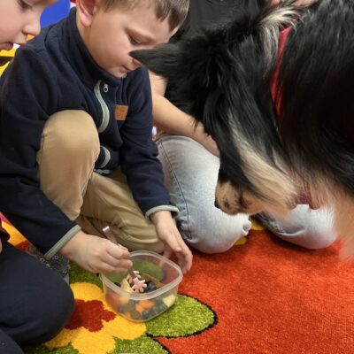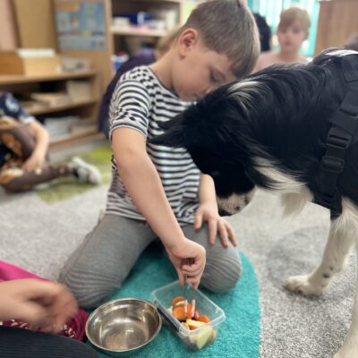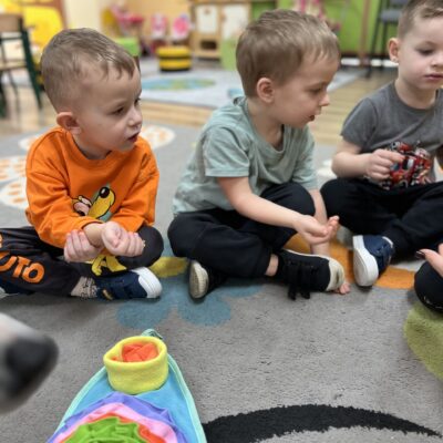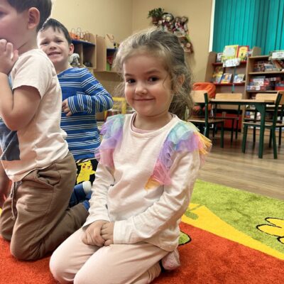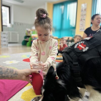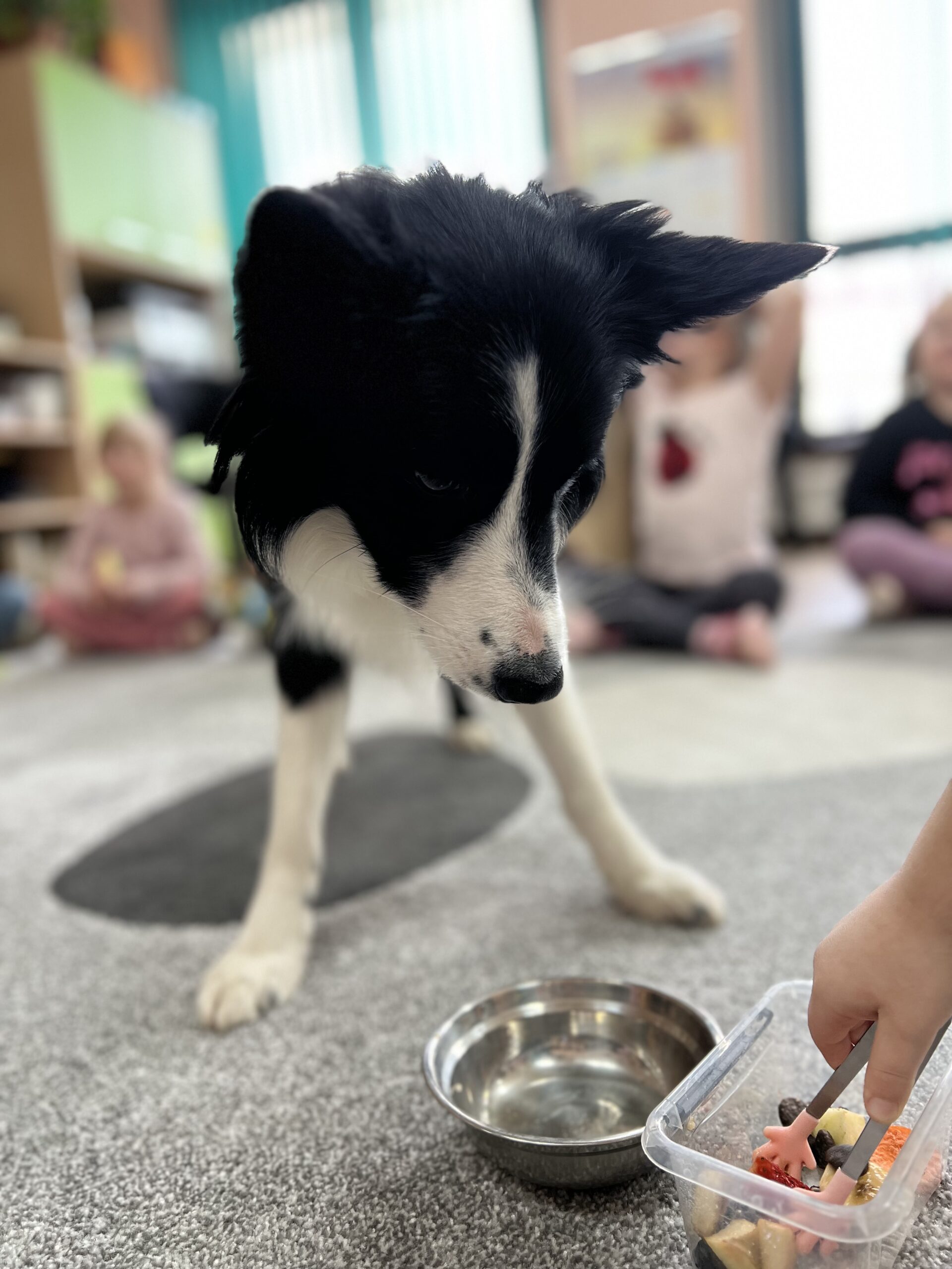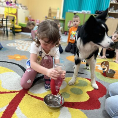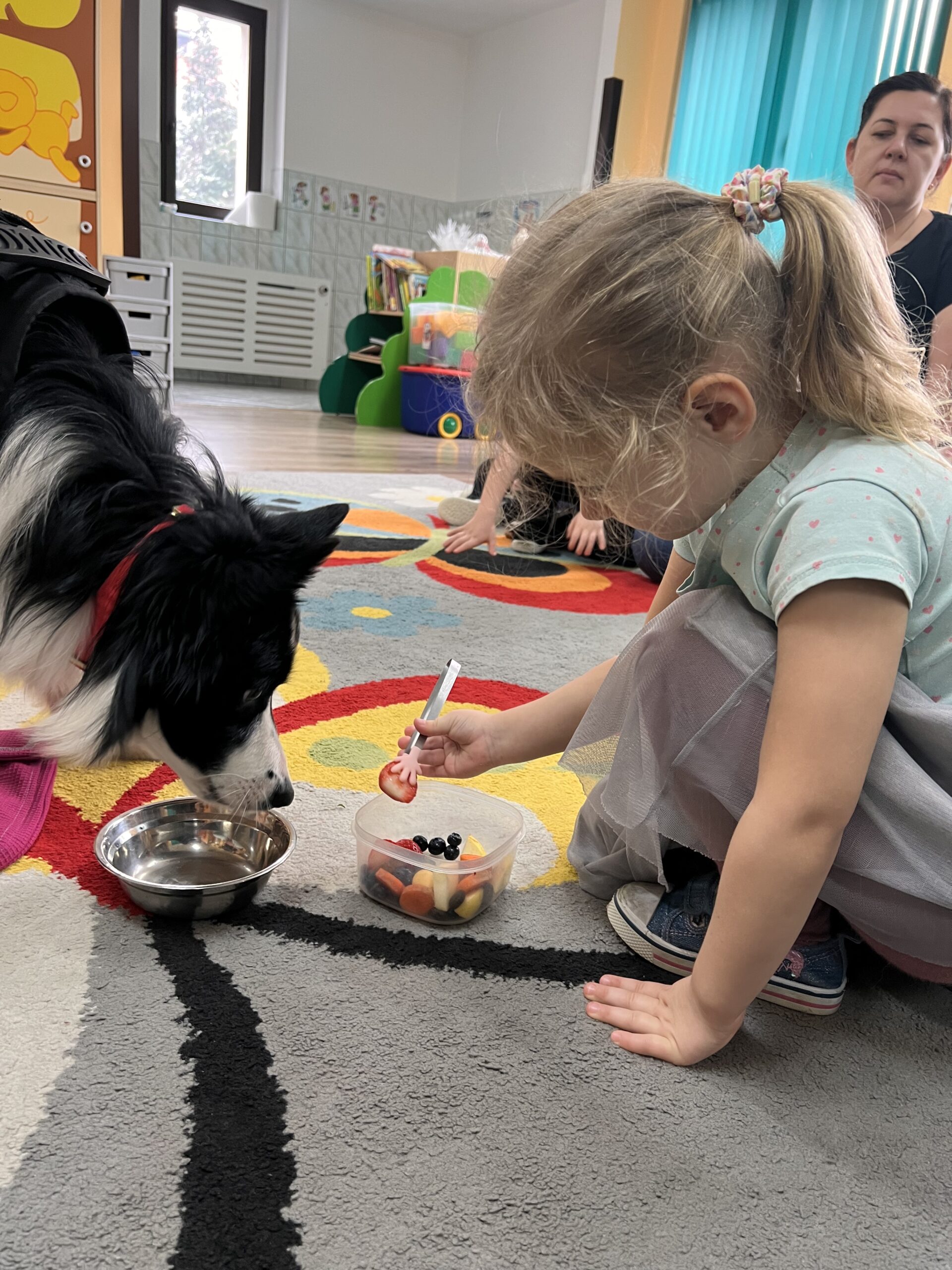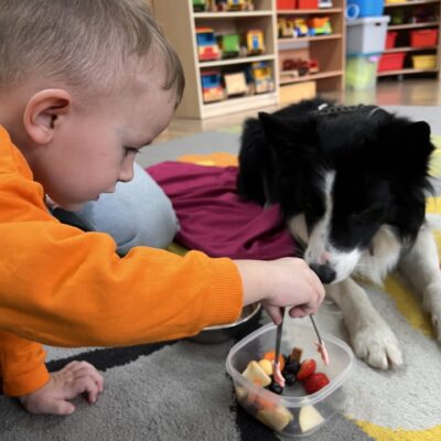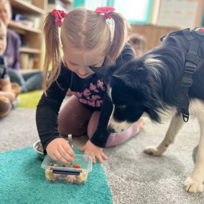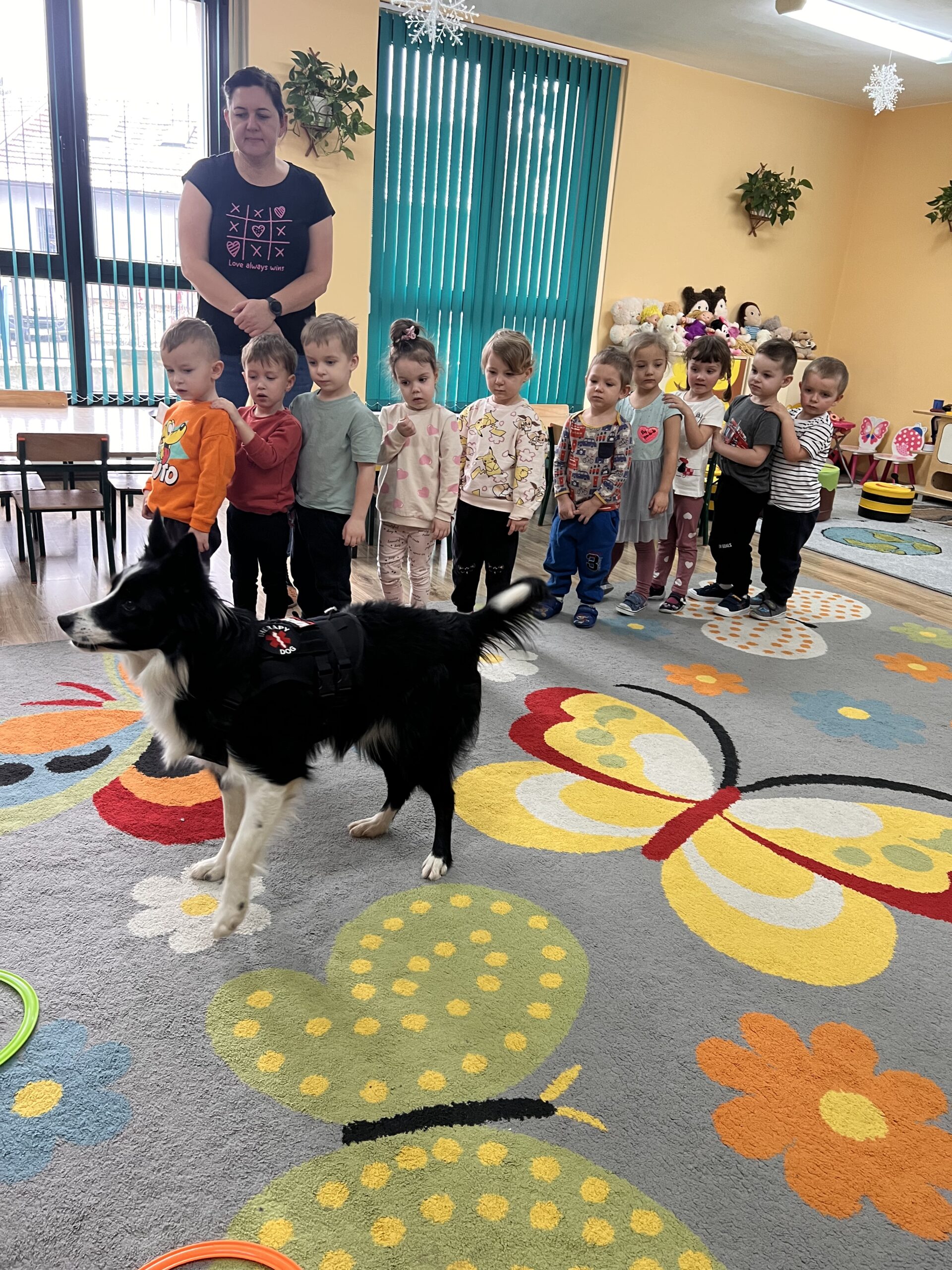 Dzieci miały okazję spotkać się z uroczą pieską Kirą, z którą nie tylko świetnie się bawiły, ale także zdobyły wiele cennych informacji. Tematem przewodnim było zdrowe odżywianie i witaminy – przedszkolaki dowiedziały się, czym możemy karmić pieska, a czego absolutnie nie wolno mu podawać. Teraz już wiedzą, że nie wszystkie smakołyki z naszego talerza są odpowiednie dla czworonogów!